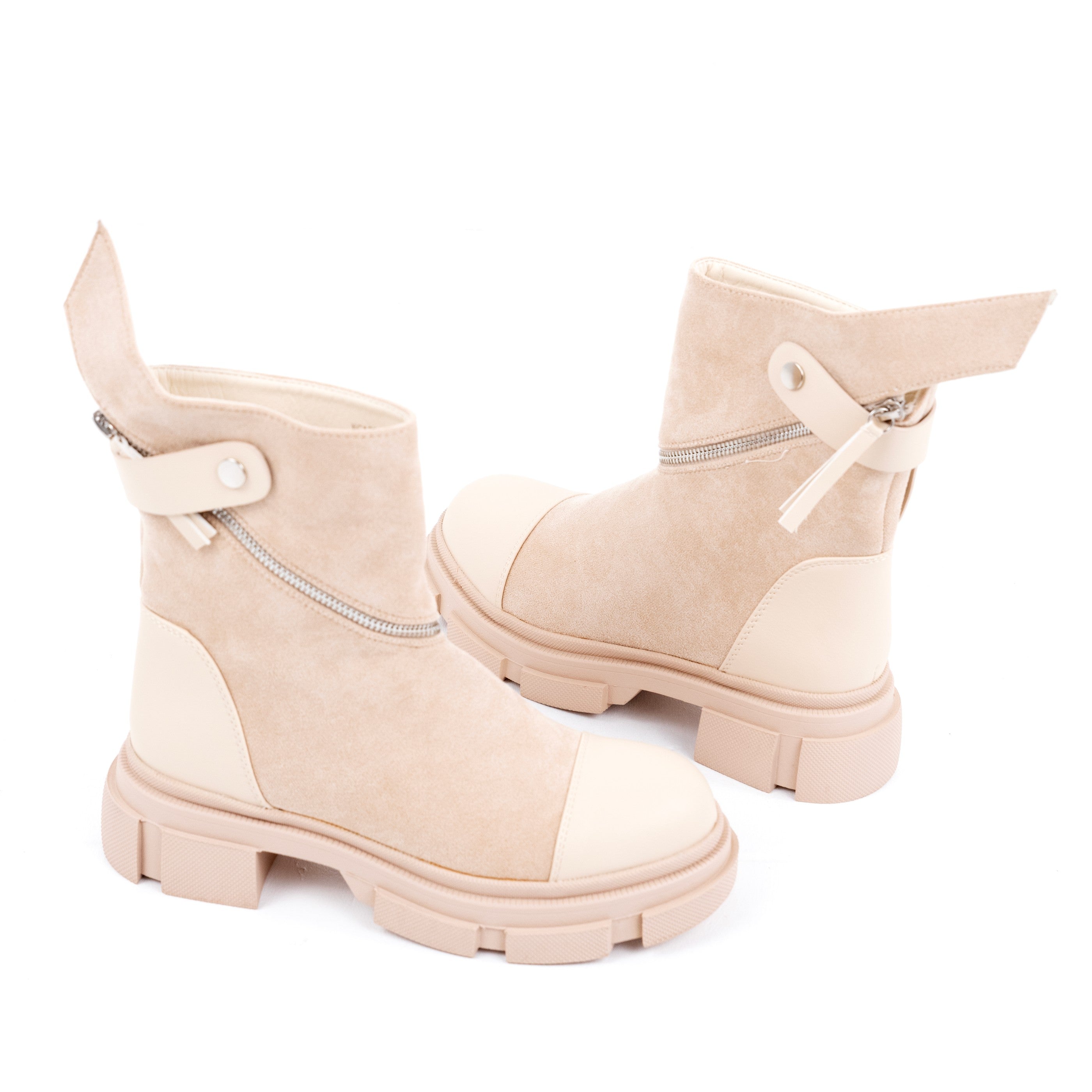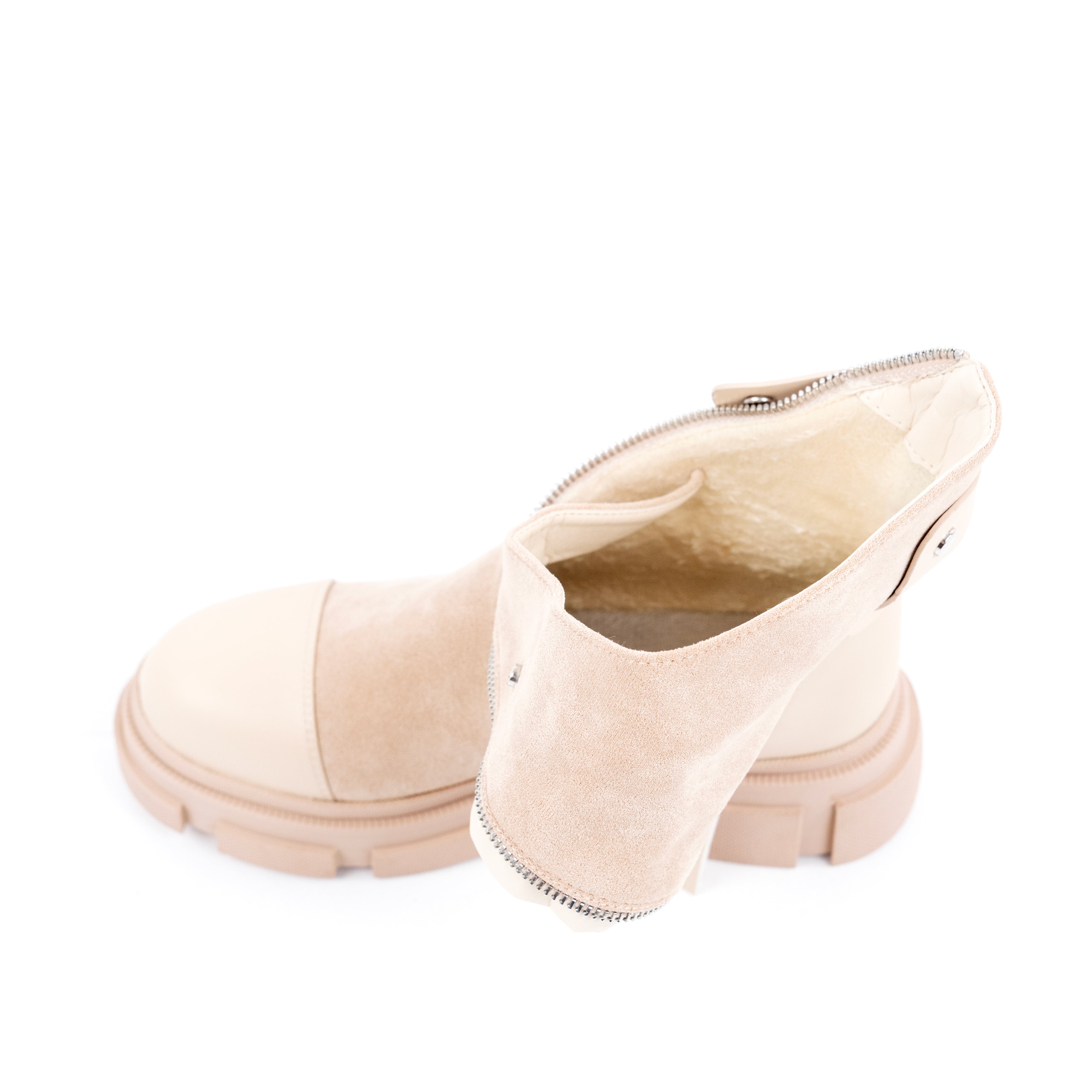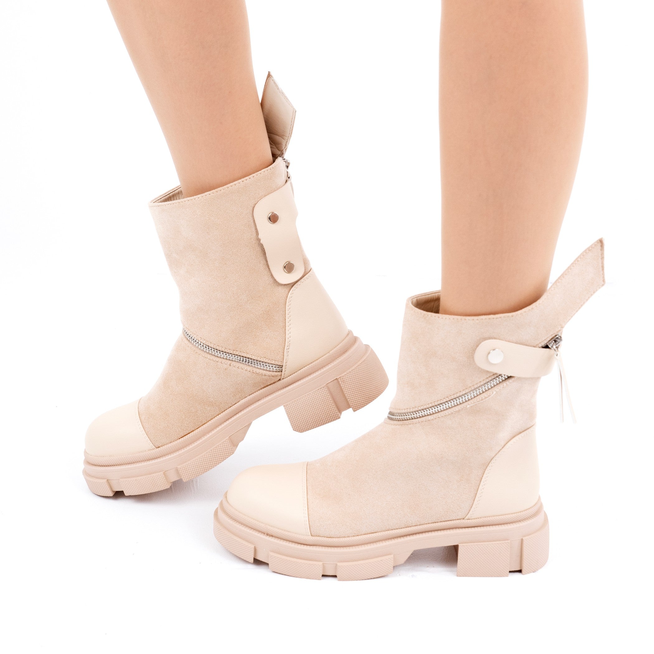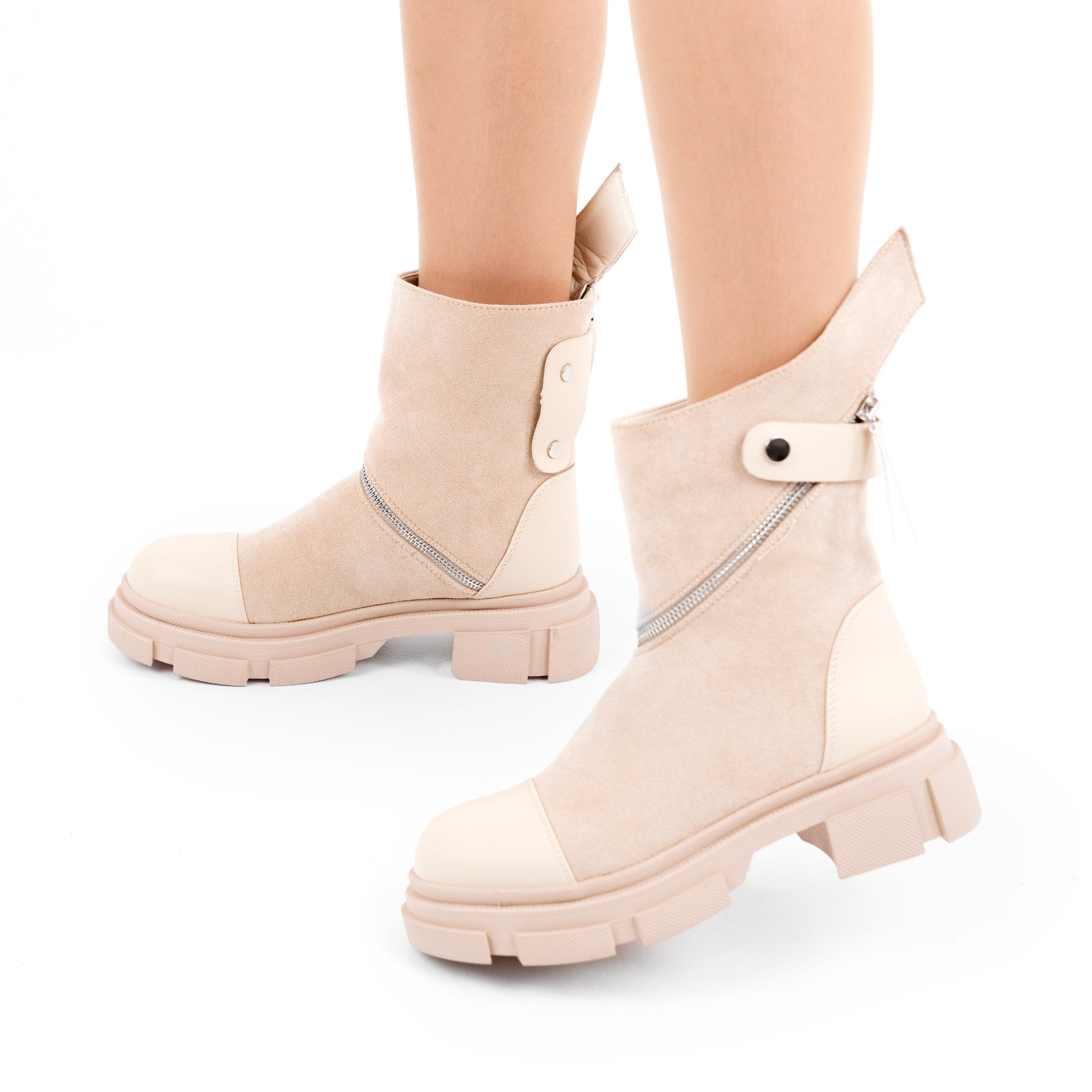 Ghetele damă crem Zasha sunt alegerea ideală pentru femeile care caută un model modern, confortabil și plin de personalitate pentru sezonul rece. Combinația dintre pielea ecologică și pielea ecologică întoarsă oferă un mix elegant de texturi, cu un aspect premium și o versatilitate excelentă în ținutele casual. Talpa groasă de 4 cm asigură stabilitate, confort și un plus de înălțime, fiind perfectă pentru plimbări sau activități zilnice. Designul cu fermoar lateral permite încălțarea rapidă, iar accesoriul de pe partea superioară adaugă un detaliu fashion care face ghetele speciale. Nuanța caldă de crem se potrivește ușor cu jeanși, pantaloni largi, pulovere sau ținute de zi cu zi, oferind un look modern și luminos. Modelul Zasha se remarcă prin forma robustă, cusăturile atent lucrate și calapodul confortabil, fiind conceput pentru femeile care își doresc încălțăminte practică, dar în tendințe. Indiferent de outfit, aceste ghete aduc un plus de stil și originalitate, fiind o piesă statement pentru garderoba de toamnă-iarnă.