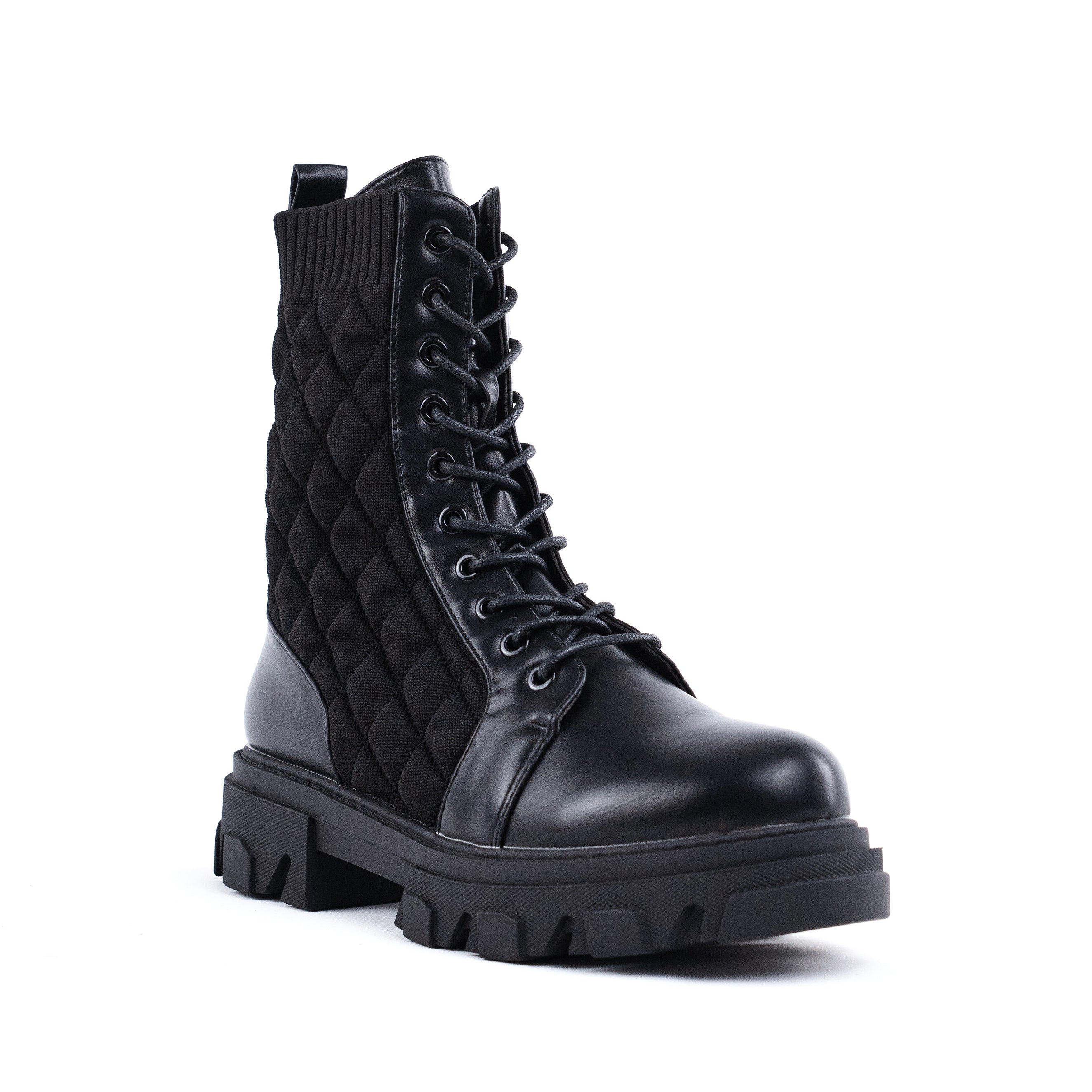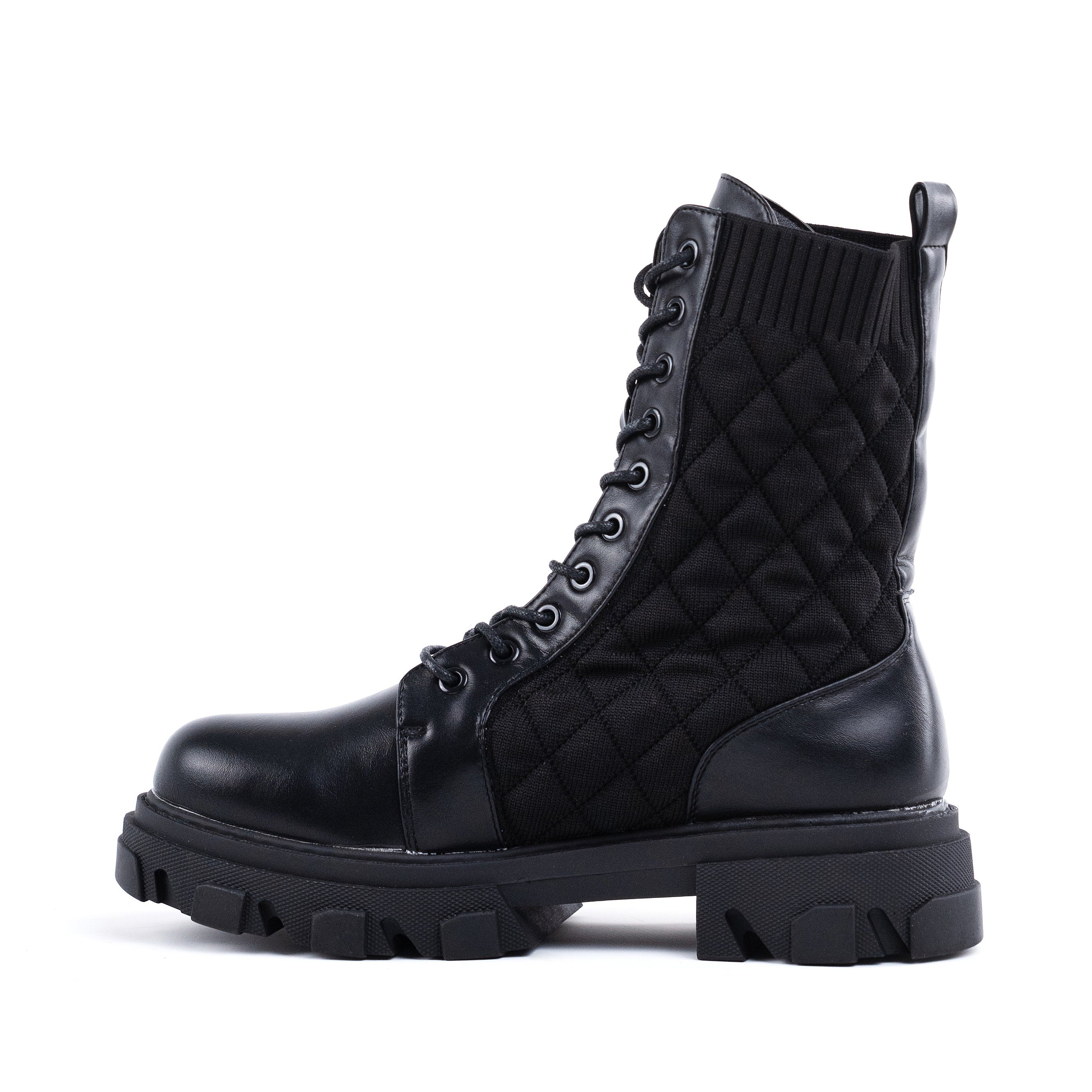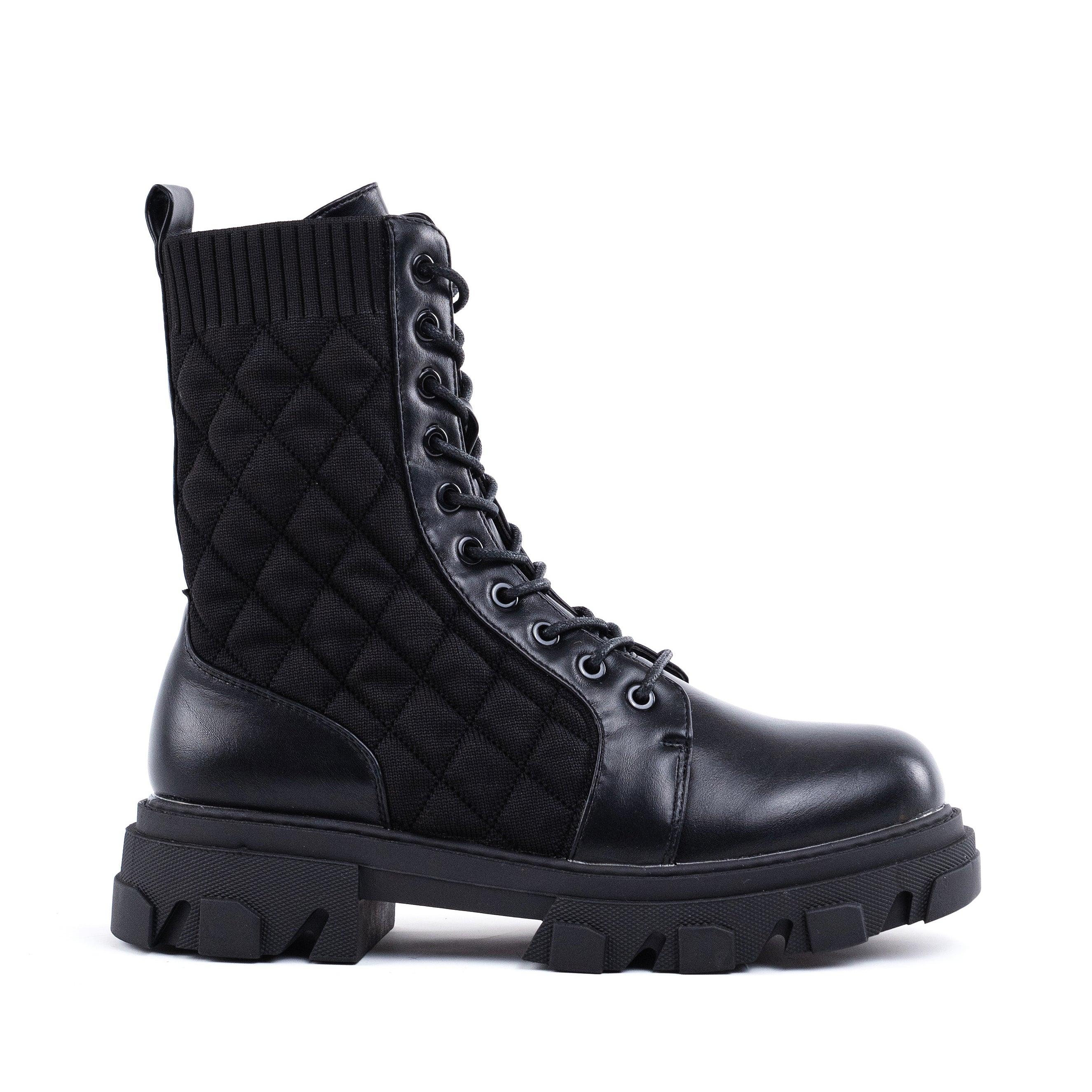 Ghetele damă negru Azaleea sunt alegerea ideală pentru un look modern și îndrăzneț, perfecte pentru sezonul rece datorită designului robust și combinației de piele ecologică cu material textil matlasat, care oferă atât stil, cât și confort. Partea textilă creează un efect vizual premium, în timp ce zonele din piele ecologică adaugă durabilitate și un aspect bine definit. Talpa groasă de 4 cm asigură stabilitate și izolare excelentă, fiind potrivită pentru zile active și suprafețe variate. Sistemul de închidere cu șiret permite ajustarea perfectă pe picior, oferind susținere optimă și o adaptare confortabilă. Designul înalt modelează frumos glezna și conferă o notă urbană, modernă, perfectă pentru ținute casual, streetwear sau layering de toamnă-iarnă. Modelul Azaleea este creat pentru femeile care vor o pereche de ghete statement, versatile și extrem de comode, adaptate ritmului zilnic.