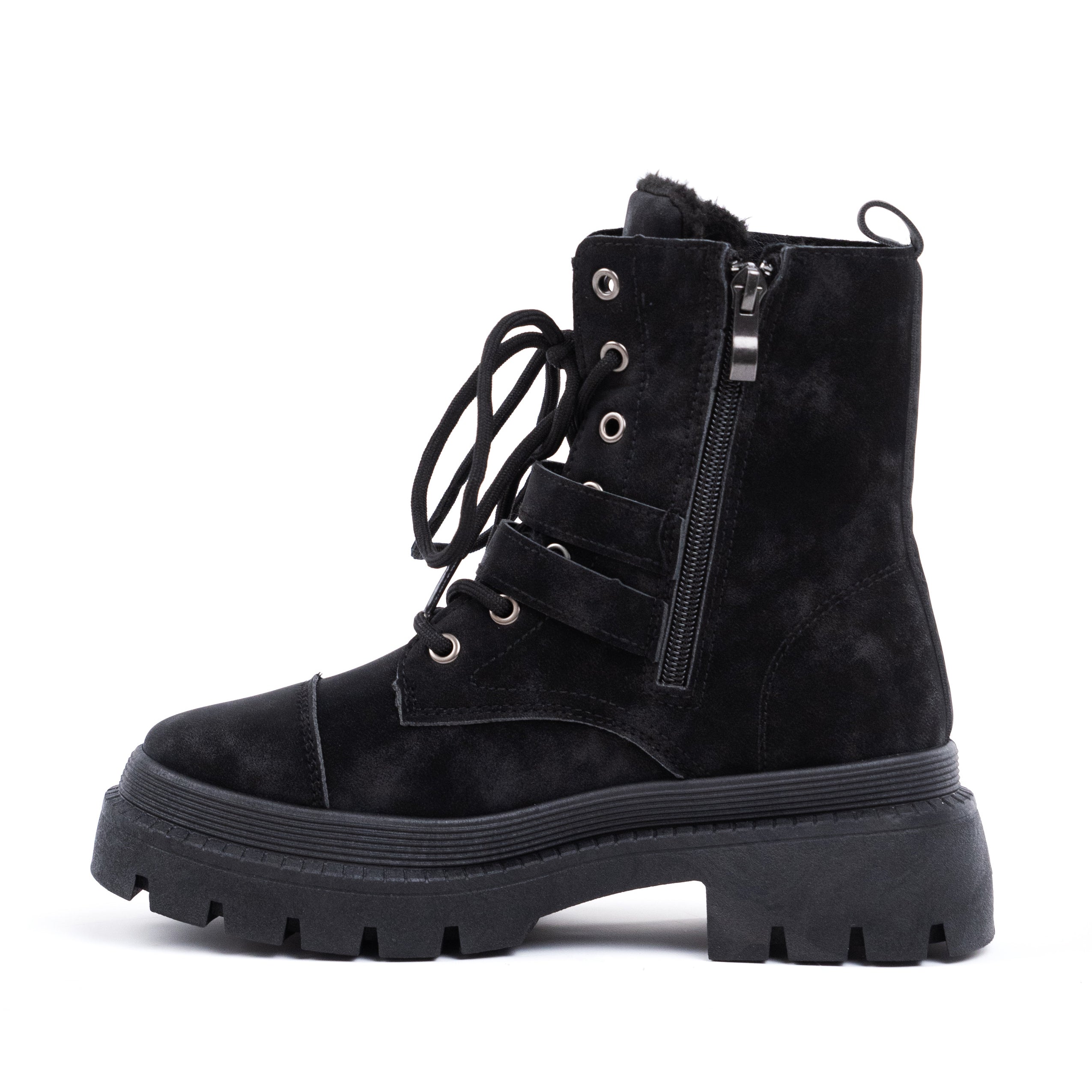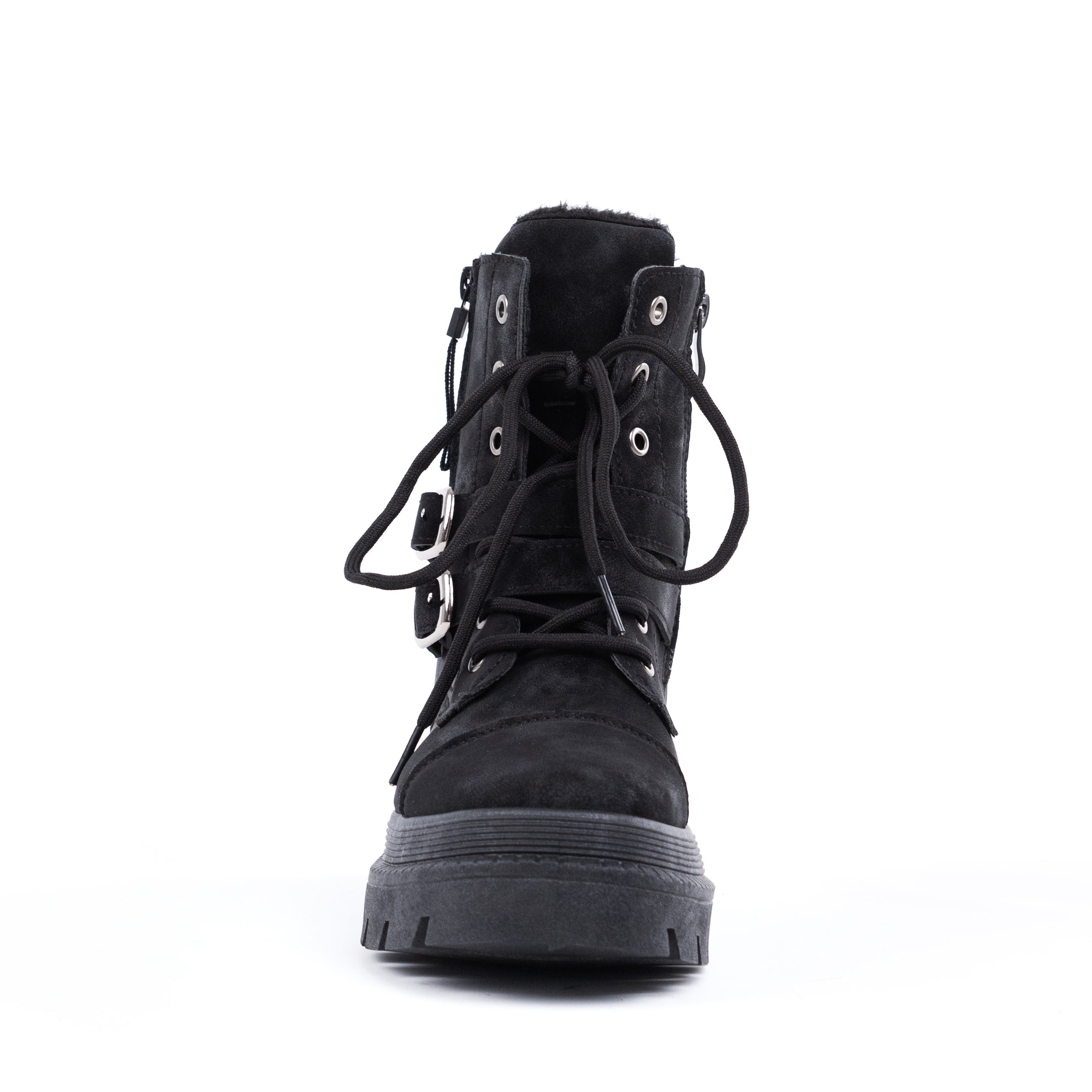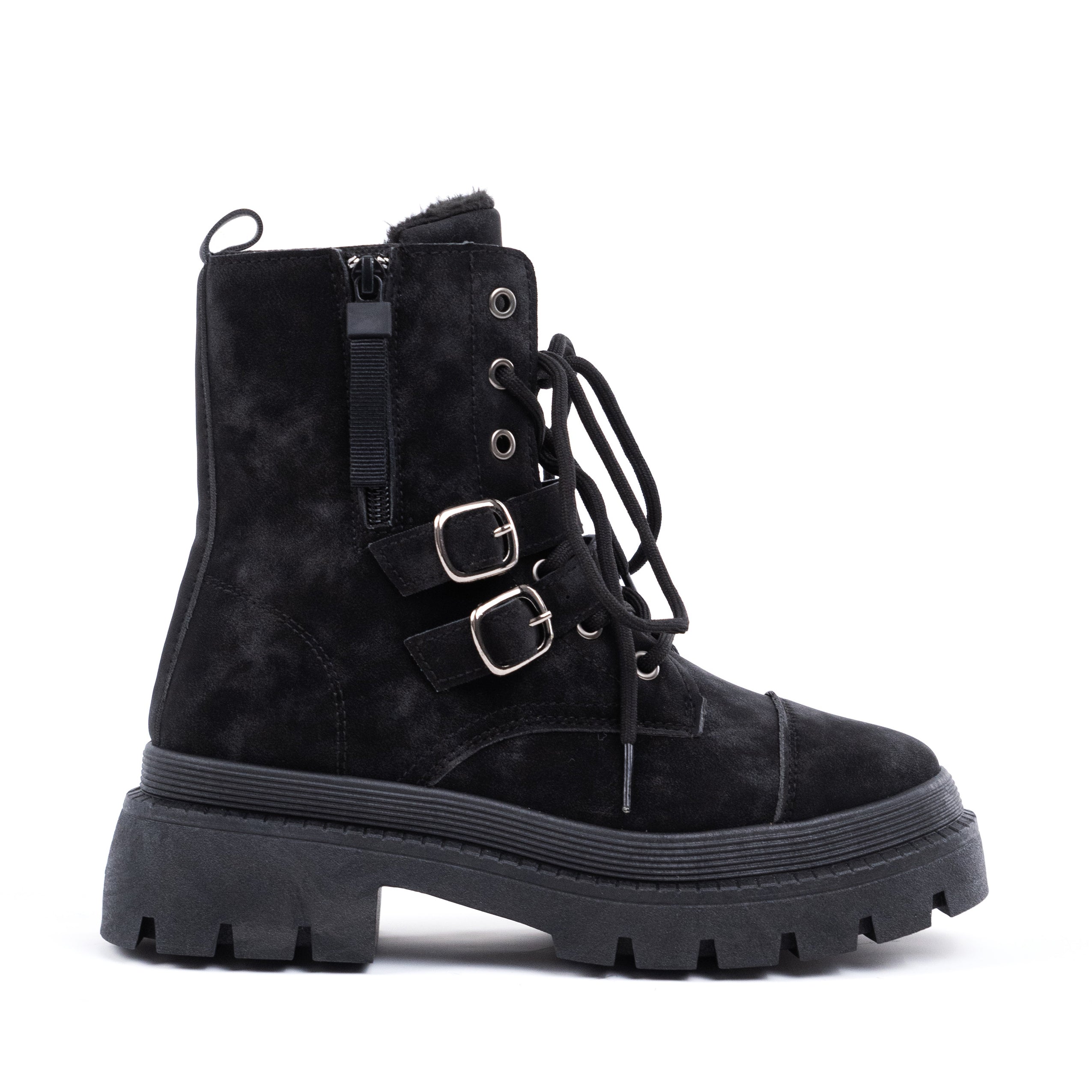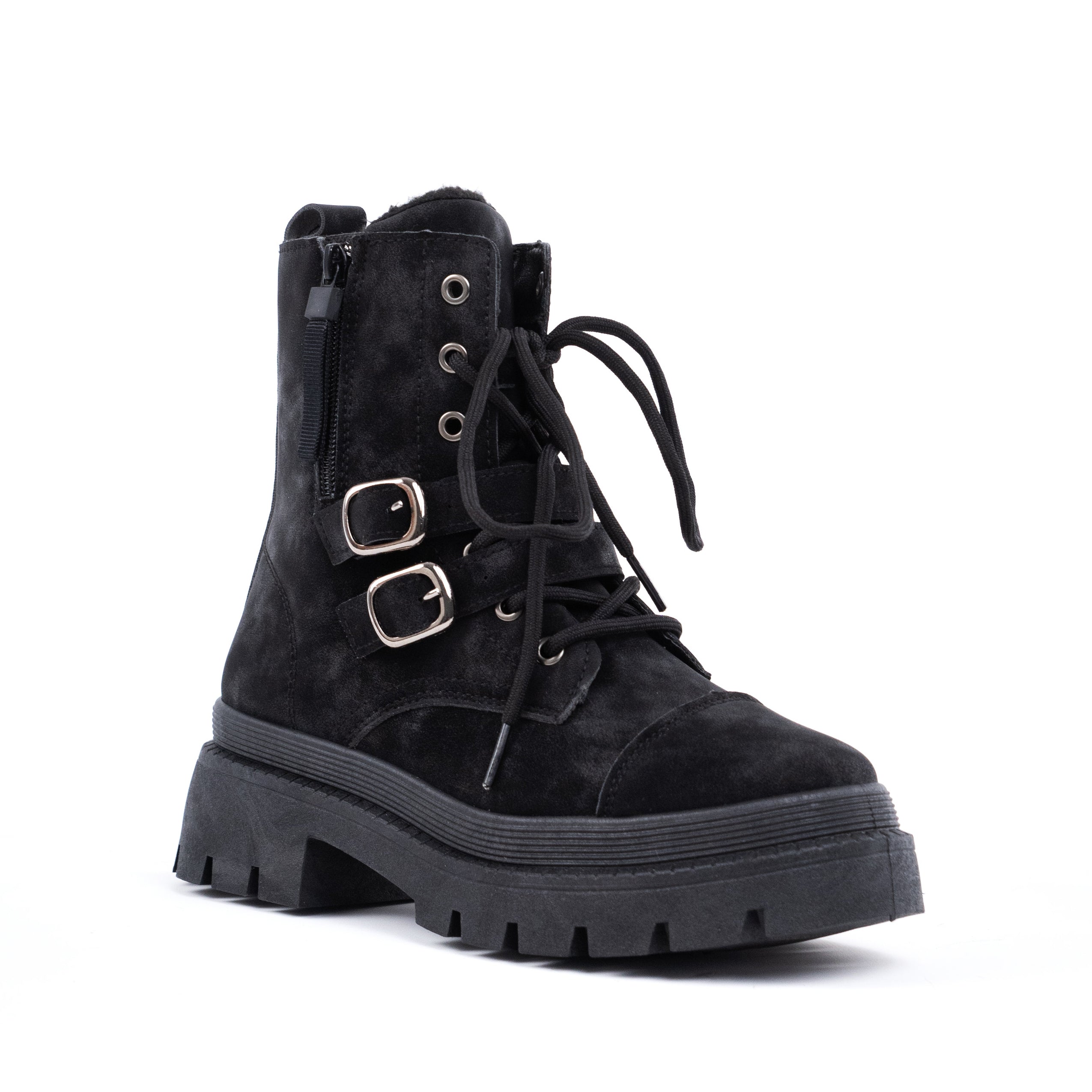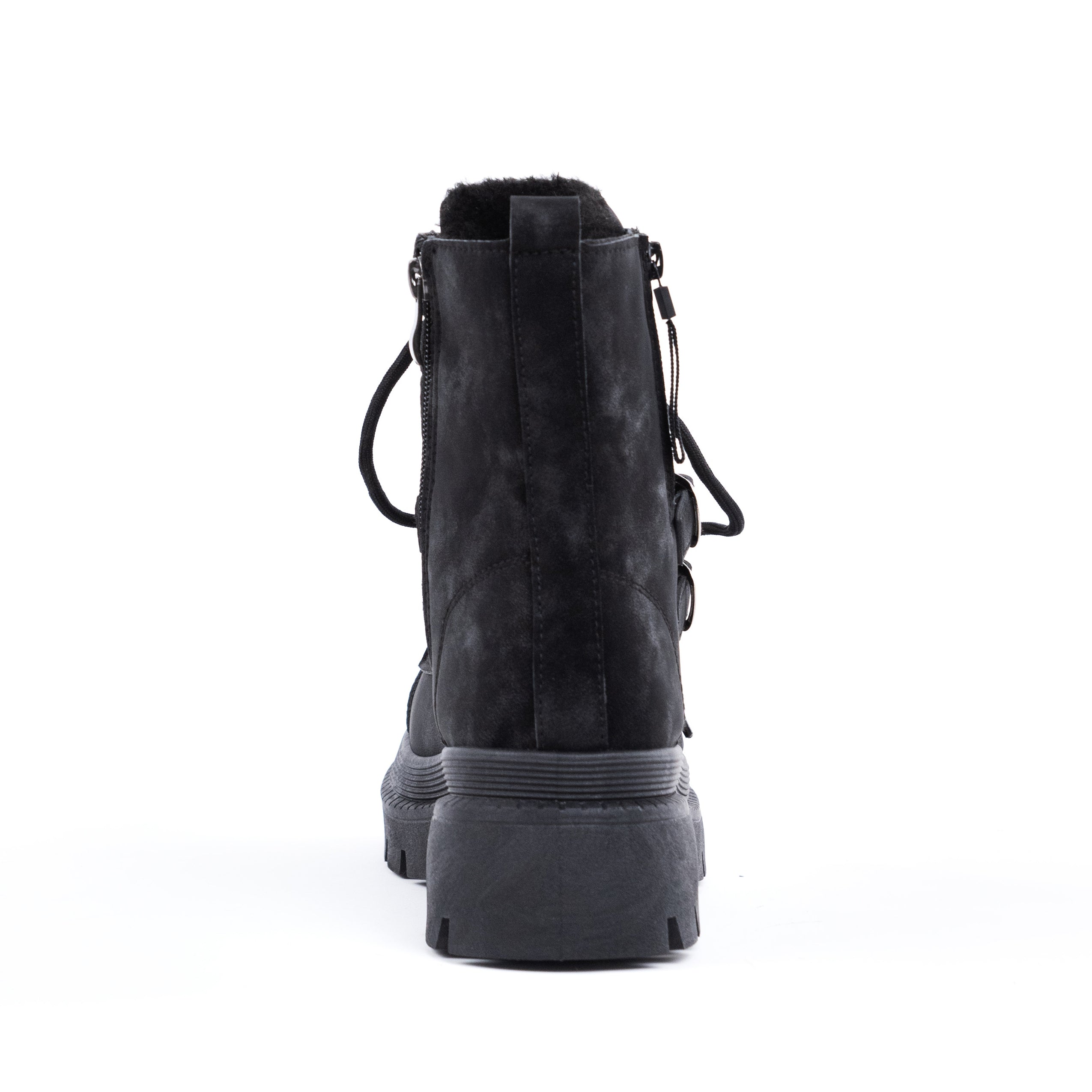 Ghetele damă Eletra în nuanță neagră sunt alegerea perfectă pentru un look urban, modern și confortabil în sezonul rece. Realizate din piele ecologică întoarsă, acestea oferă un aspect rafinat și o textură moale la atingere. Talpa groasă de 4 cm asigură stabilitate și confort sporit, fiind ideală pentru zilele reci sau ploioase. Închiderea dublă cu fermoar și șiret oferă o fixare perfectă pe picior, iar detaliile metalice sub formă de catarame adaugă un plus de stil și atitudine. Designul robust, dar feminin, face ca aceste ghete să fie ușor de integrat în ținute casual-chic, cu blugi, hanorace sau paltoane lungi. Un model versatil, creat pentru femeile care iubesc confortul, dar nu renunță niciodată la stil.
