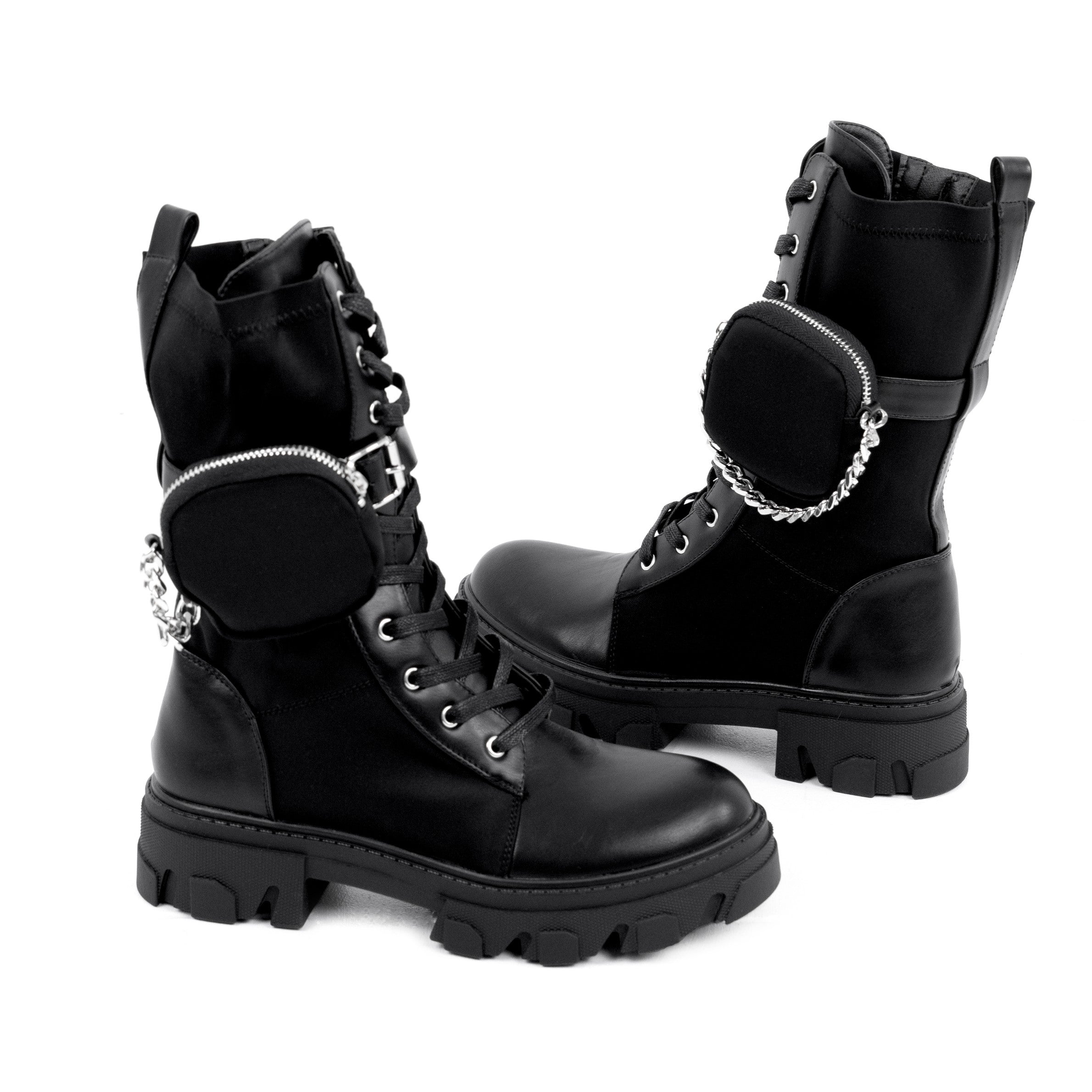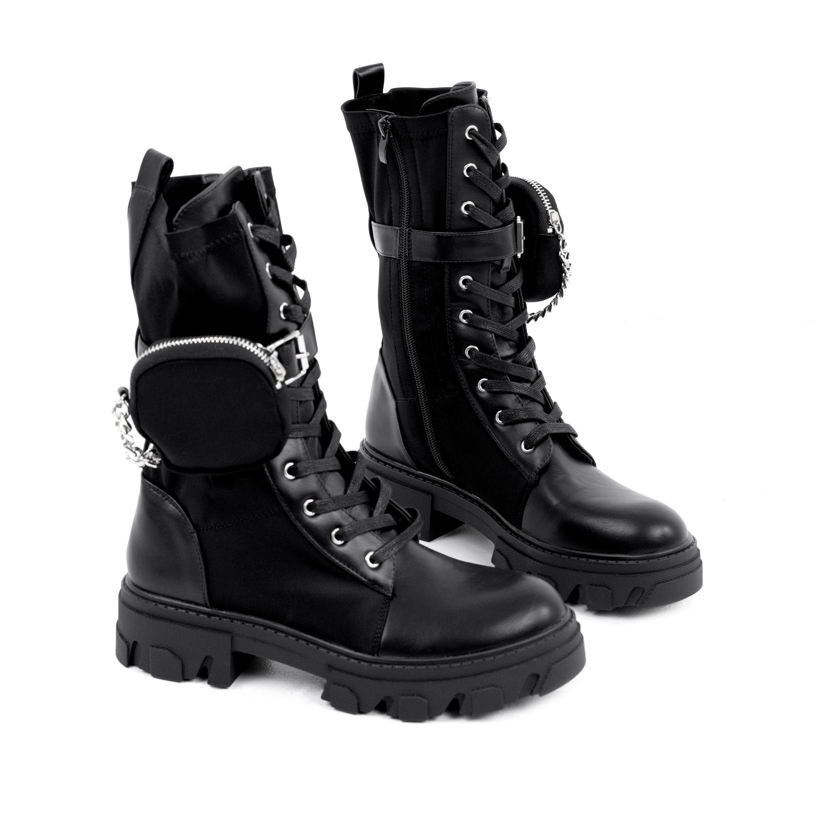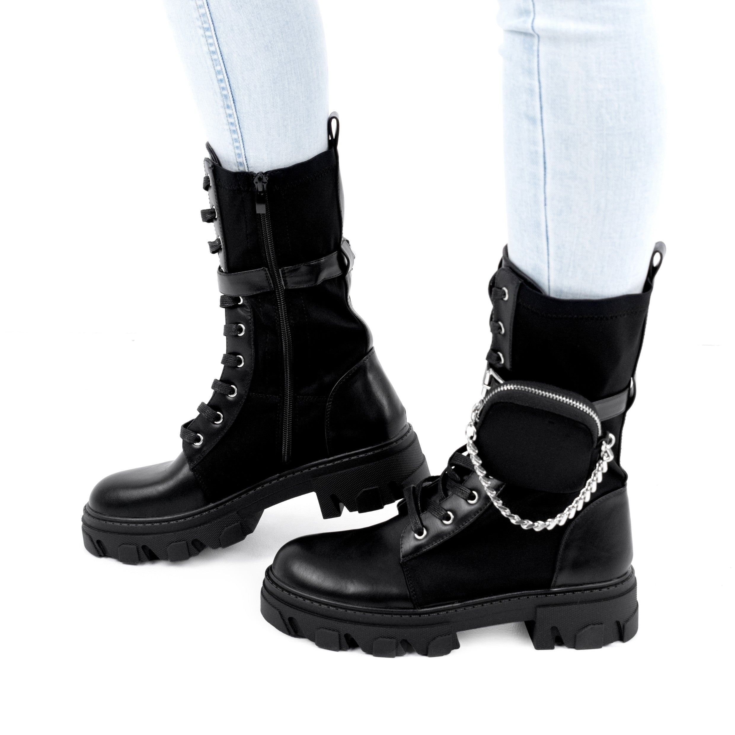 Ghetele damă negru Isadora sunt alegerea ideală pentru femeile care iubesc stilul urban, modern și versatil. Realizate din piele ecologică și material textil, acestea oferă durabilitate, flexibilitate și un aspect premium perfect pentru sezonul rece. Designul înalt protejează glezna și conferă o siluetă puternică, completată de accesoriul detașabil tip mini-buzunar cu lanț metalic, care transformă ghetele într-un adevărat statement fashion. Talpa groasă de 4,5 cm adaugă stabilitate, confort și un plus de înălțime, fiind ideală pentru plimbări, activități zilnice sau ținute streetwear. Închiderea dublă — fermoar lateral pentru încălțare rapidă și șiret frontal pentru ajustare perfectă — facilitează purtarea de zi cu zi. Nuanța clasică de negru le permite să se asorteze ușor cu orice outfit, de la jeanși și colanți la ținute casual chic. Modelul Isadora este conceput pentru femeile care vor un mix între funcționalitate, confort și un look modern, puternic și actual. Cu aceste ghete, fiecare pas devine mai sigur, mai comod și mult mai stylish.