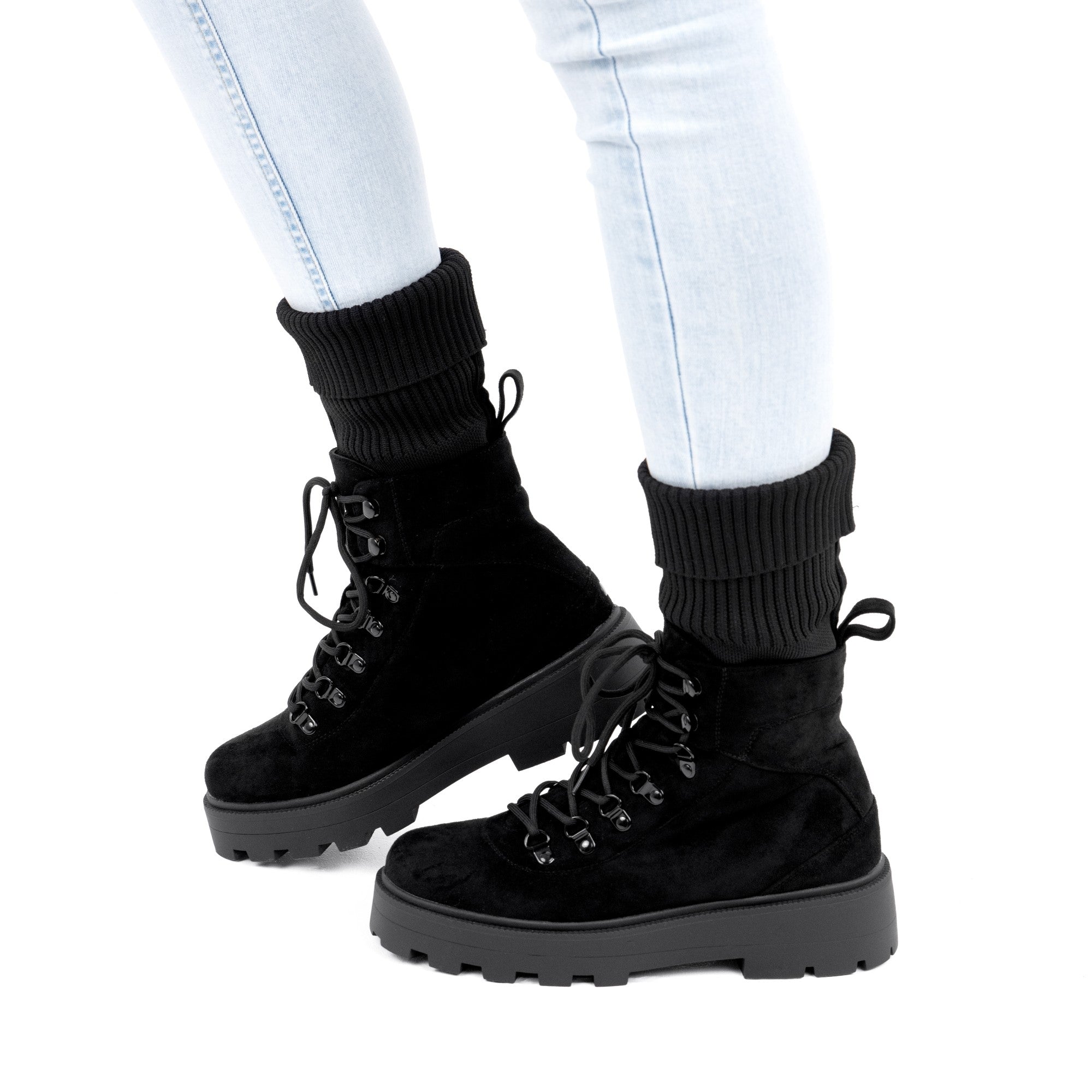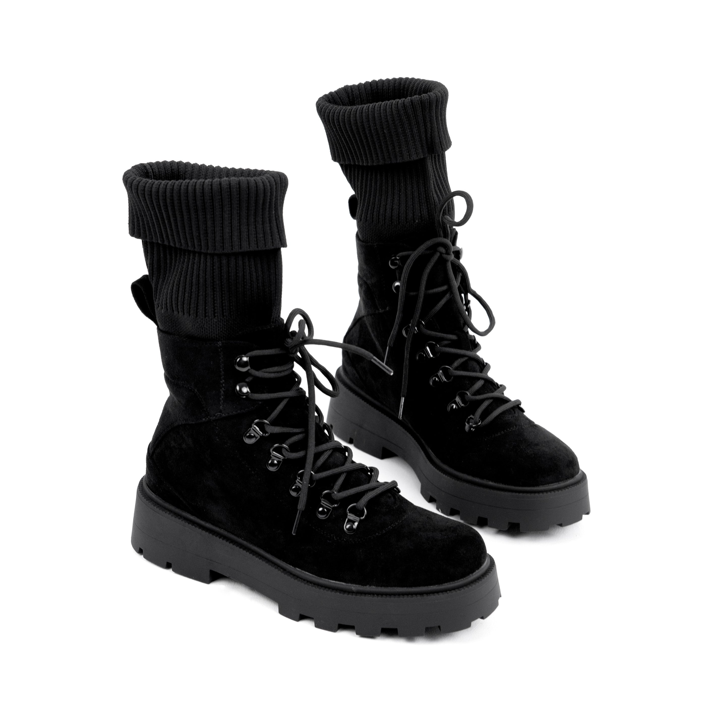 Ghetele damă negre Lucia sunt alegerea perfectă pentru zilele reci, atunci când îți dorești încălțăminte confortabilă, practică și modernă, fără să renunți la un look stylish. Realizate din piele ecologică întoarsă și material textil moale, acestea oferă o textură plăcută și un aspect premium, fiind ideale pentru ținute casual de zi cu zi. Gulerul textil gros și elastic adaugă un plus de căldură și stabilitate, creând un efect cozy care se potrivește perfect cu outfiturile de toamnă și iarnă. Talpa groasă de 4.5 cm este extrem de confortabilă, oferă aderență excelentă și susținere optimă la mers, fiind potrivită pentru plimbări lungi sau activități de exterior. Sistemul de închidere cu șiret permite ajustarea ideală pe picior, iar elementele metalice inspirate din stilul hiking adaugă un twist modern. Modelul Lucia în varianta neagră este ușor de integrat în orice ținută, de la jeanși skinny și hanorace oversize, la colanți, pulovere groase sau jachete pufoase. Confortabile, versatile și elegante în simplitatea lor, aceste ghete sunt must-have-ul sezonului rece.