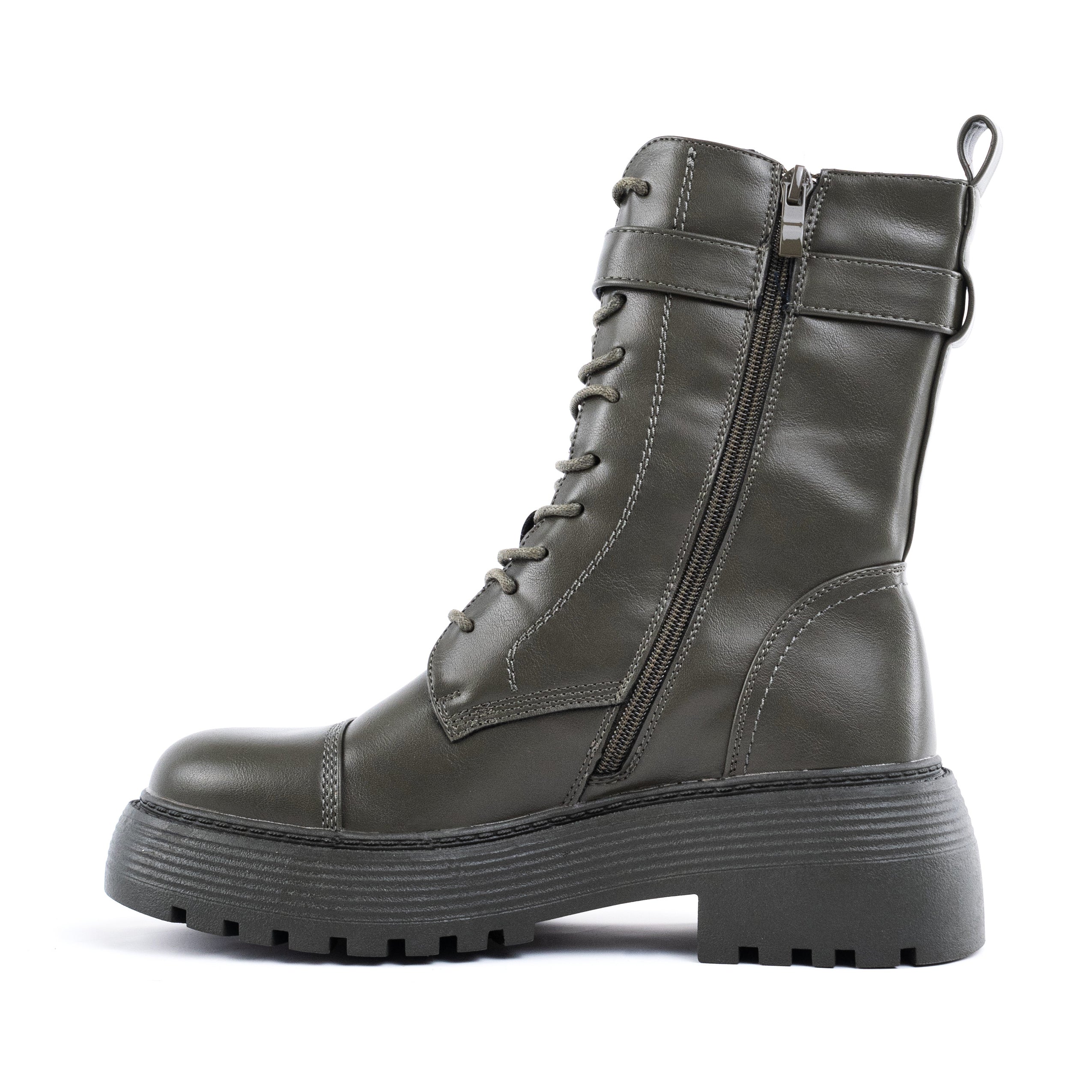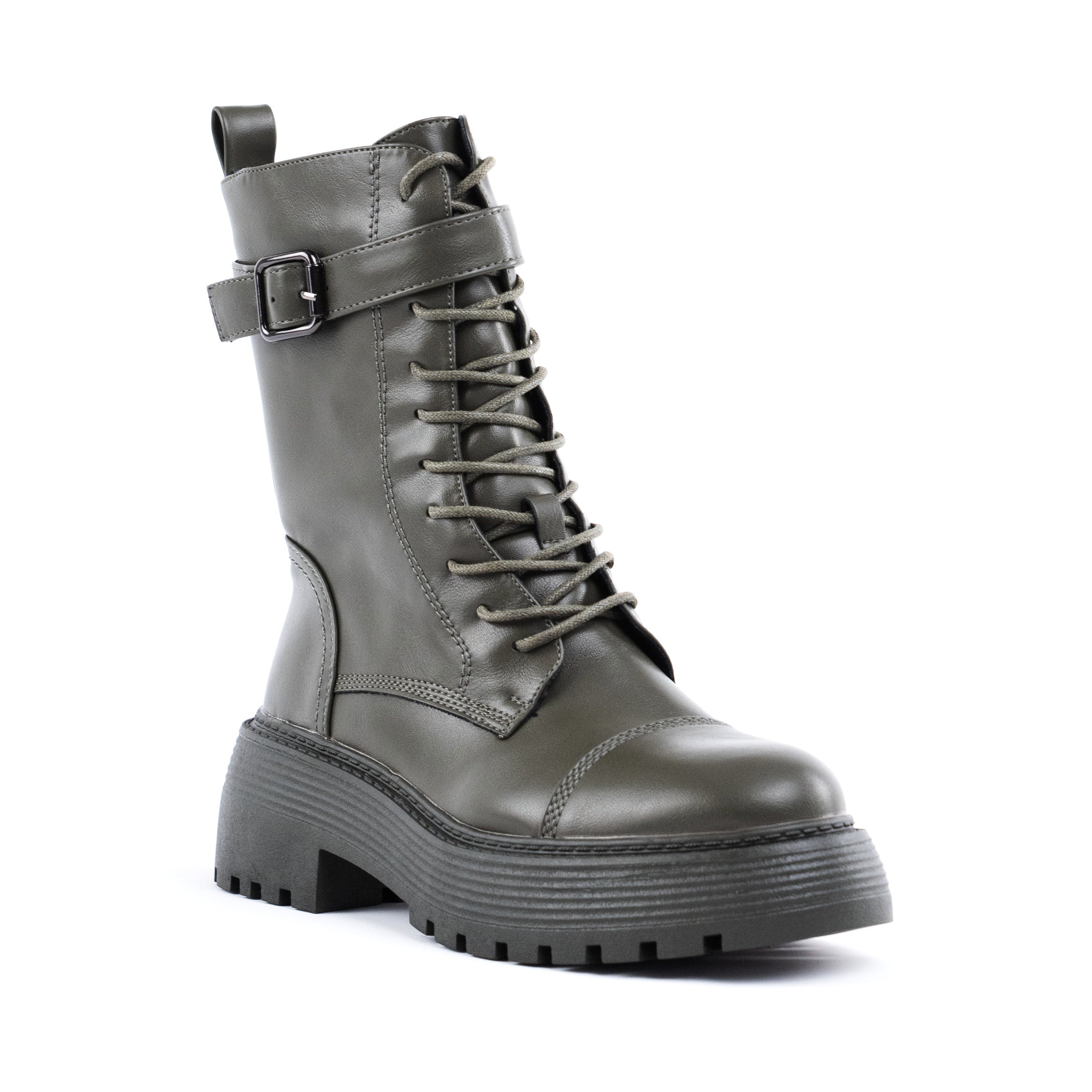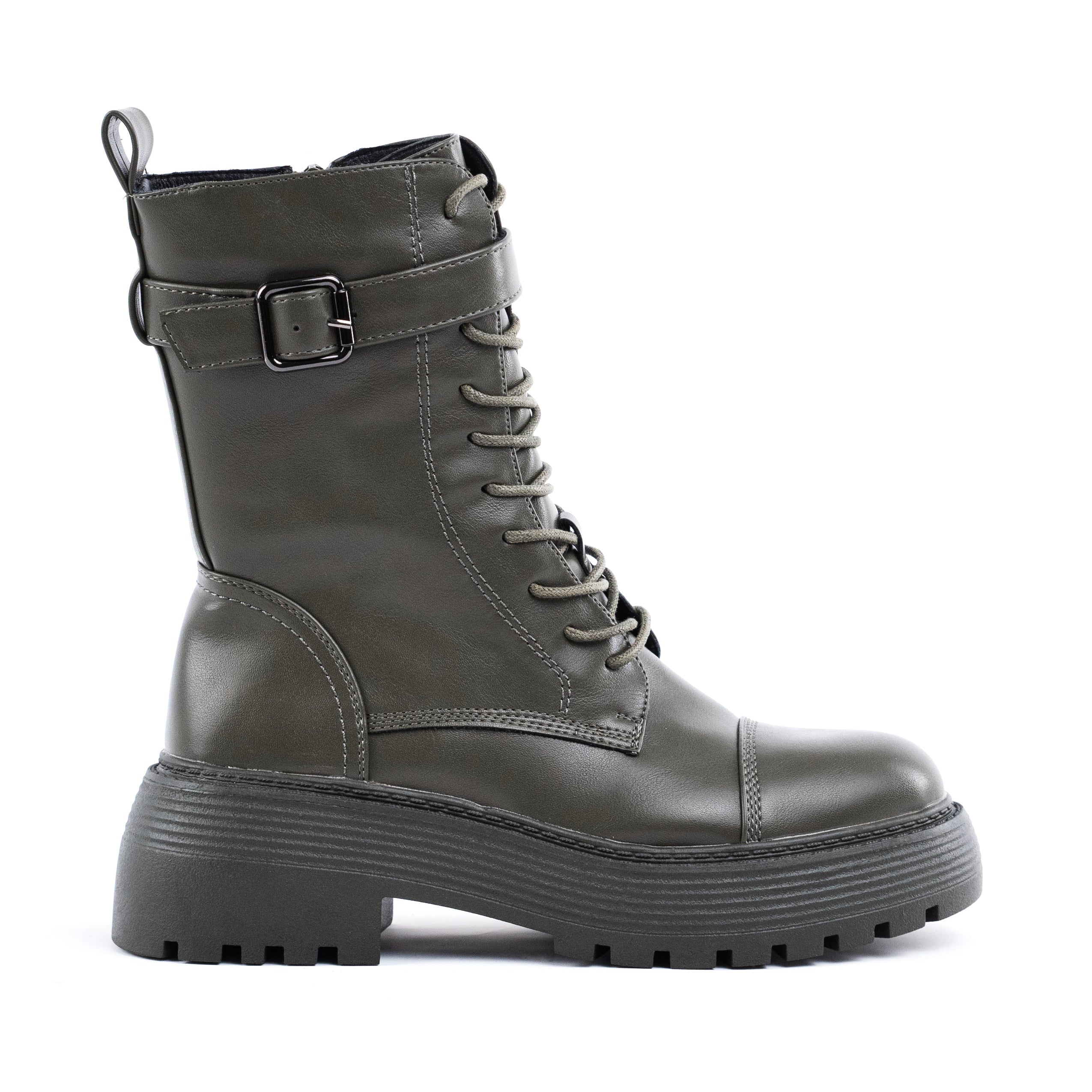 Ghetele damă verde îmblănite Tess aduc combinația perfectă între stil modern și confort termic, fiind alegerea ideală pentru zilele reci în care ai nevoie de încălțăminte practică, dar și atrăgătoare. Construcția din piele ecologică rezistentă oferă durabilitate pe termen lung, iar nuanța de verde kaki conferă un aspect urban, ușor de integrat în ținutele de sezon. Interiorul îmblănit menține căldura optimă, transformând fiecare pas într-o experiență confortabilă chiar și în zilele friguroase. Talpa groasă de 5 cm asigură stabilitate, aderență excelentă și un plus de înălțime, fără să sacrifice confortul la mers. Închiderea practică cu fermoar lateral și șireturi permite încălțarea rapidă și reglarea perfectă pe picior, iar catarama decorativă din partea superioară completează un design plin de personalitate. Modelul Tess este potrivit pentru ținute casual, fiind perfect pentru plimbări, activități zilnice și outfituri cu jeanși, veste pufoase sau paltoane oversized. Aceste ghete sunt o alegere inspirată pentru femeile care își doresc versatilitate, stil și căldură într-o singură pereche de încălțăminte.