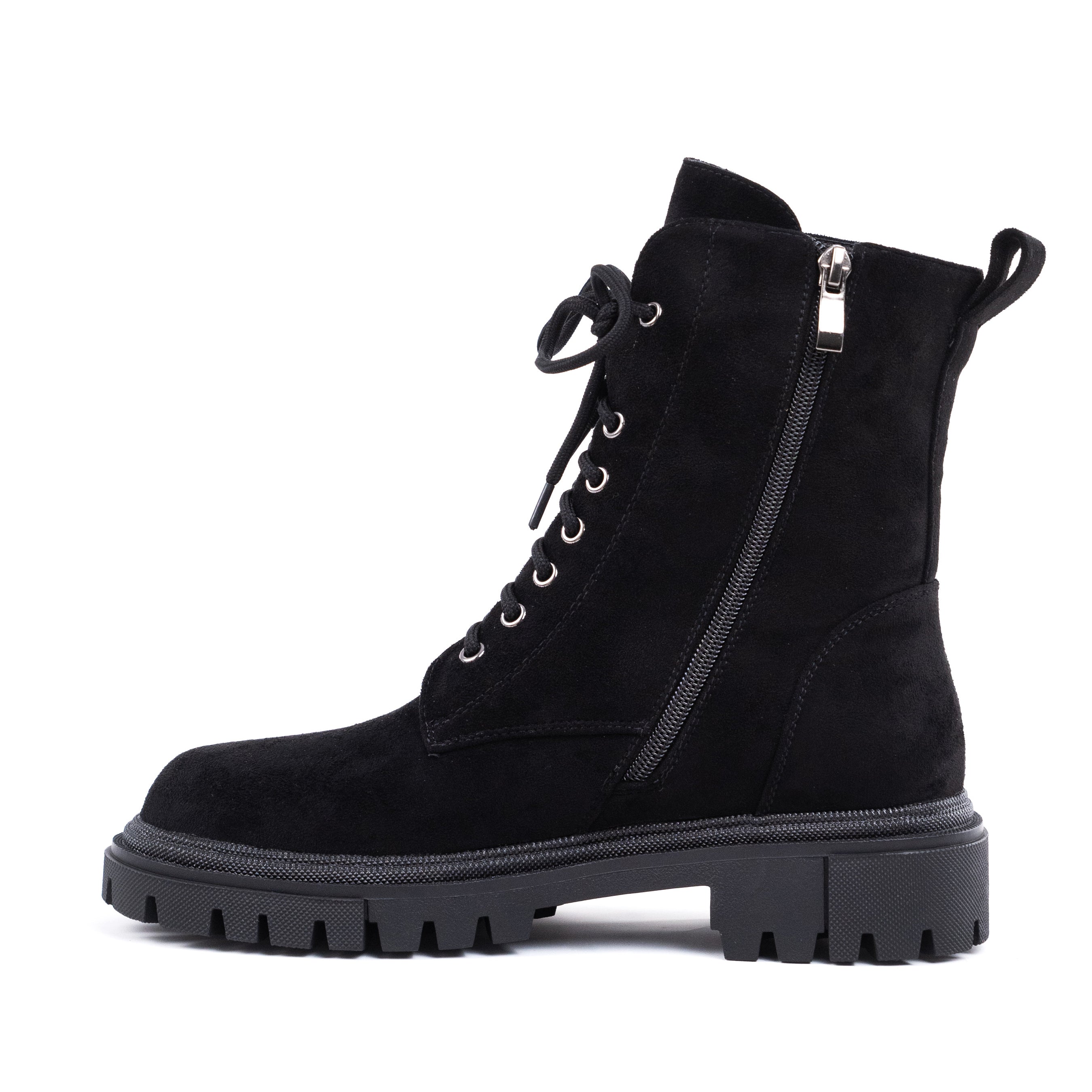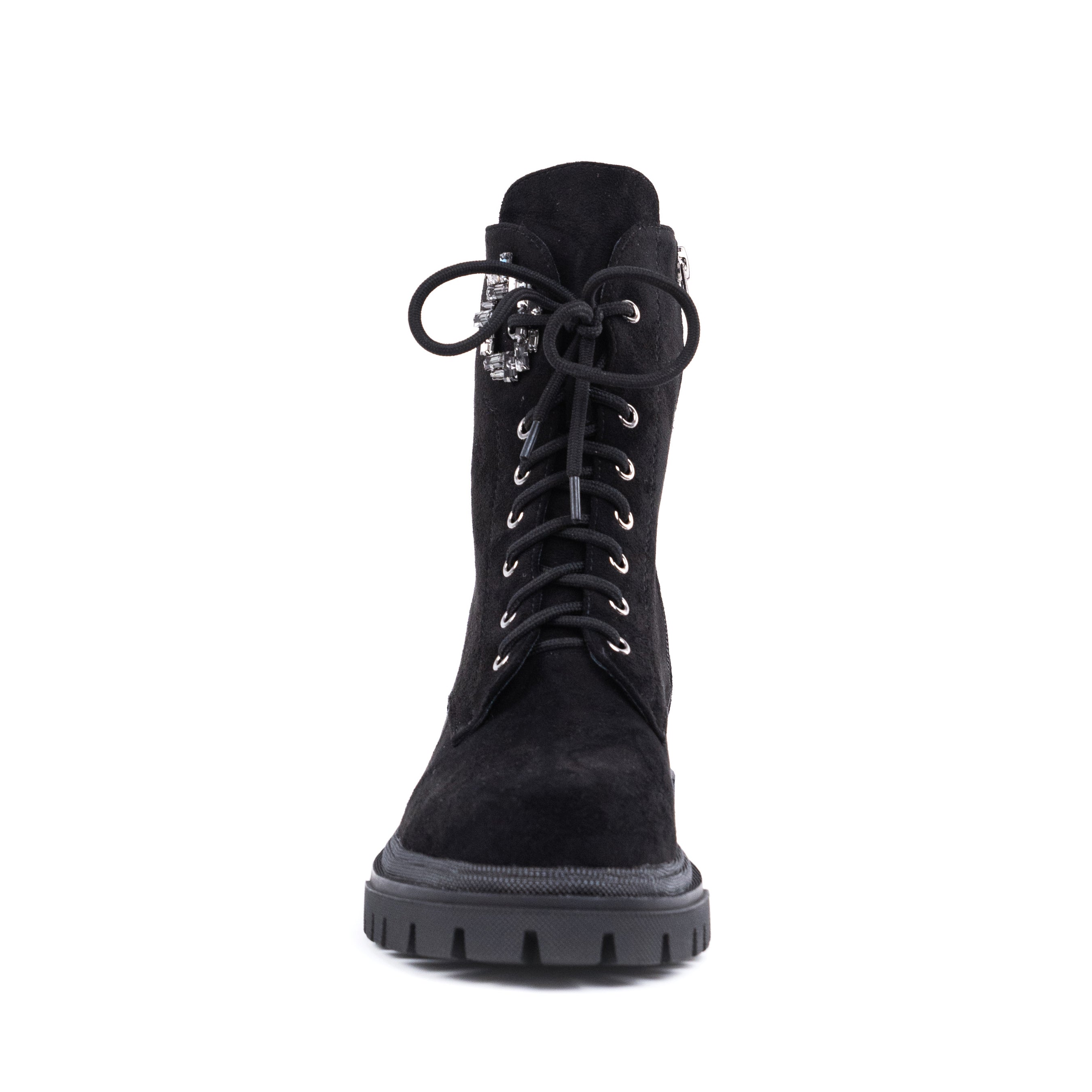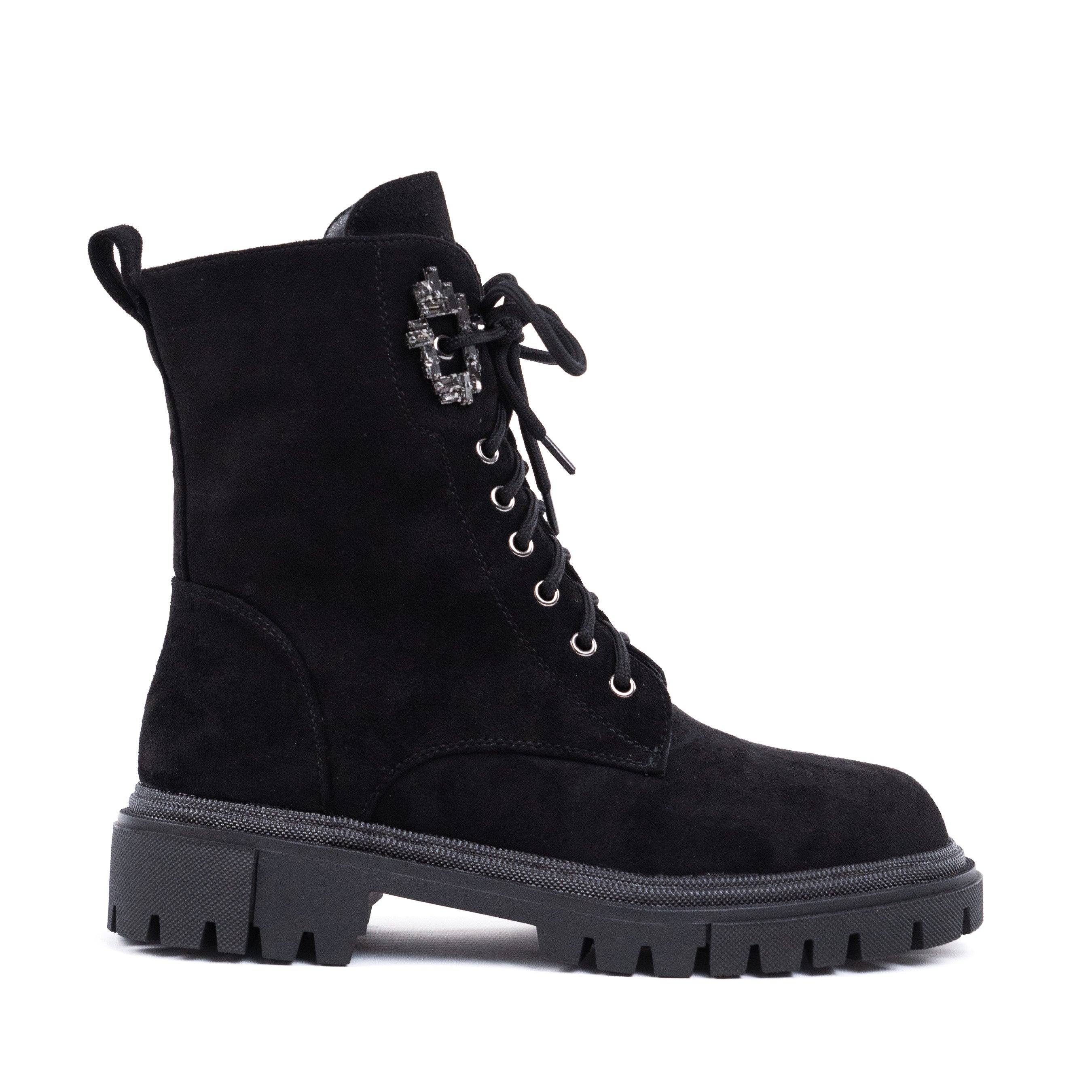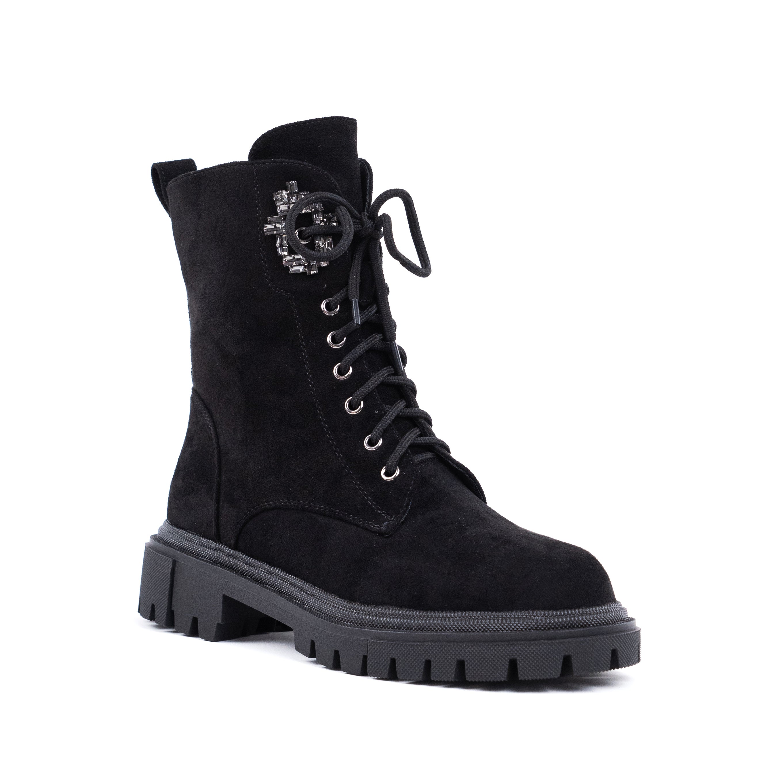 Ghetele damă negre Meda sunt un model statement, care îmbină perfect designul robust cu detalii elegante, fiind ideale pentru un look modern și feminin. Realizate din piele ecologică întoarsă, aceste ghete ies în evidență prin detaliul decorativ tip bijuterie aplicat lateral, ce adaugă un accent sofisticat și rafinat. Talpa groasă de 3,5 cm oferă stabilitate și confort la purtare, iar sistemul de închidere mixt, cu fermoar și șiret, asigură atât susținere optimă, cât și o încălțare practică. Modelul Meda se potrivește perfect atât ținutelor casual, cât și celor smart-casual, fiind ușor de asortat cu blugi, pantaloni sau rochii pentru un outfit actual și stilat.