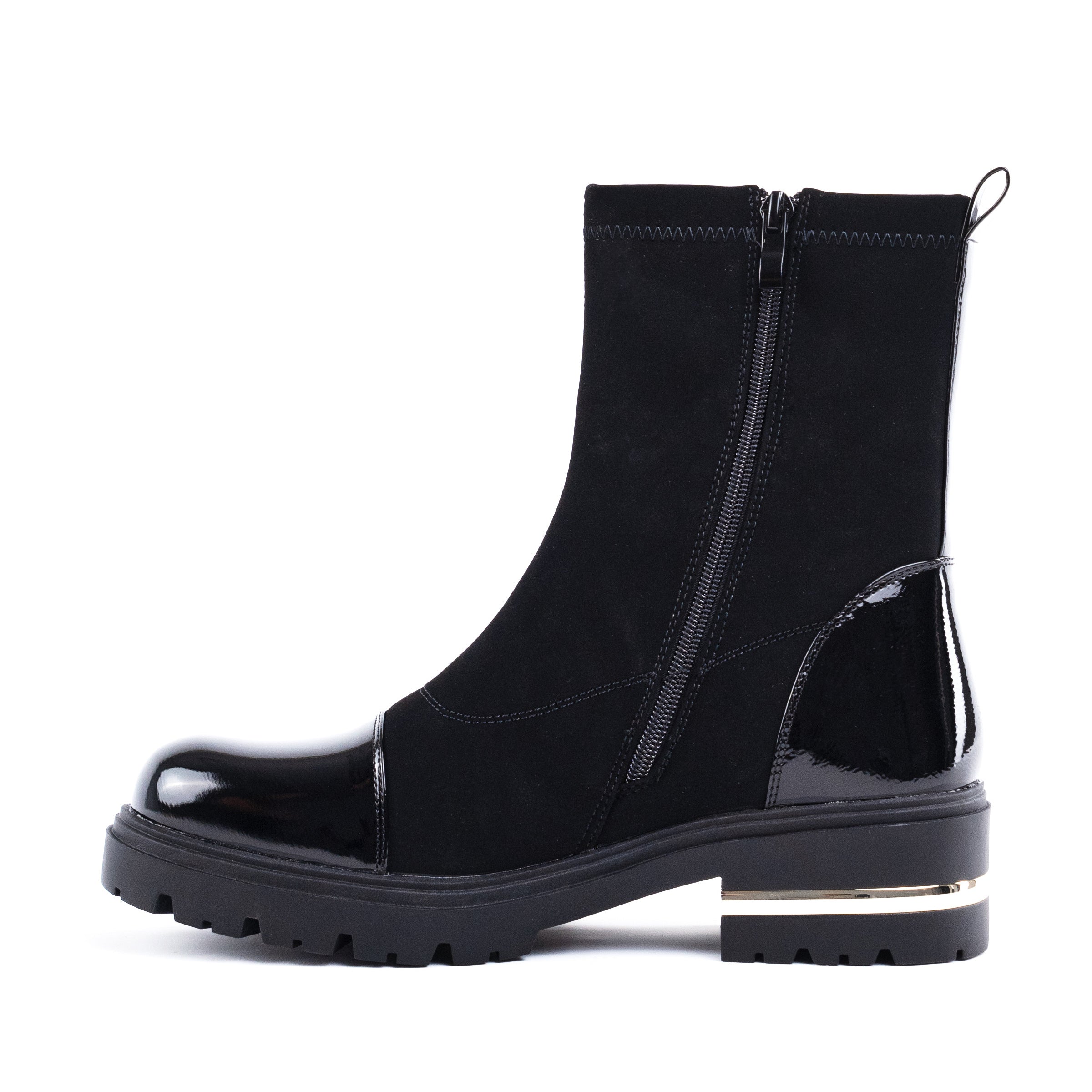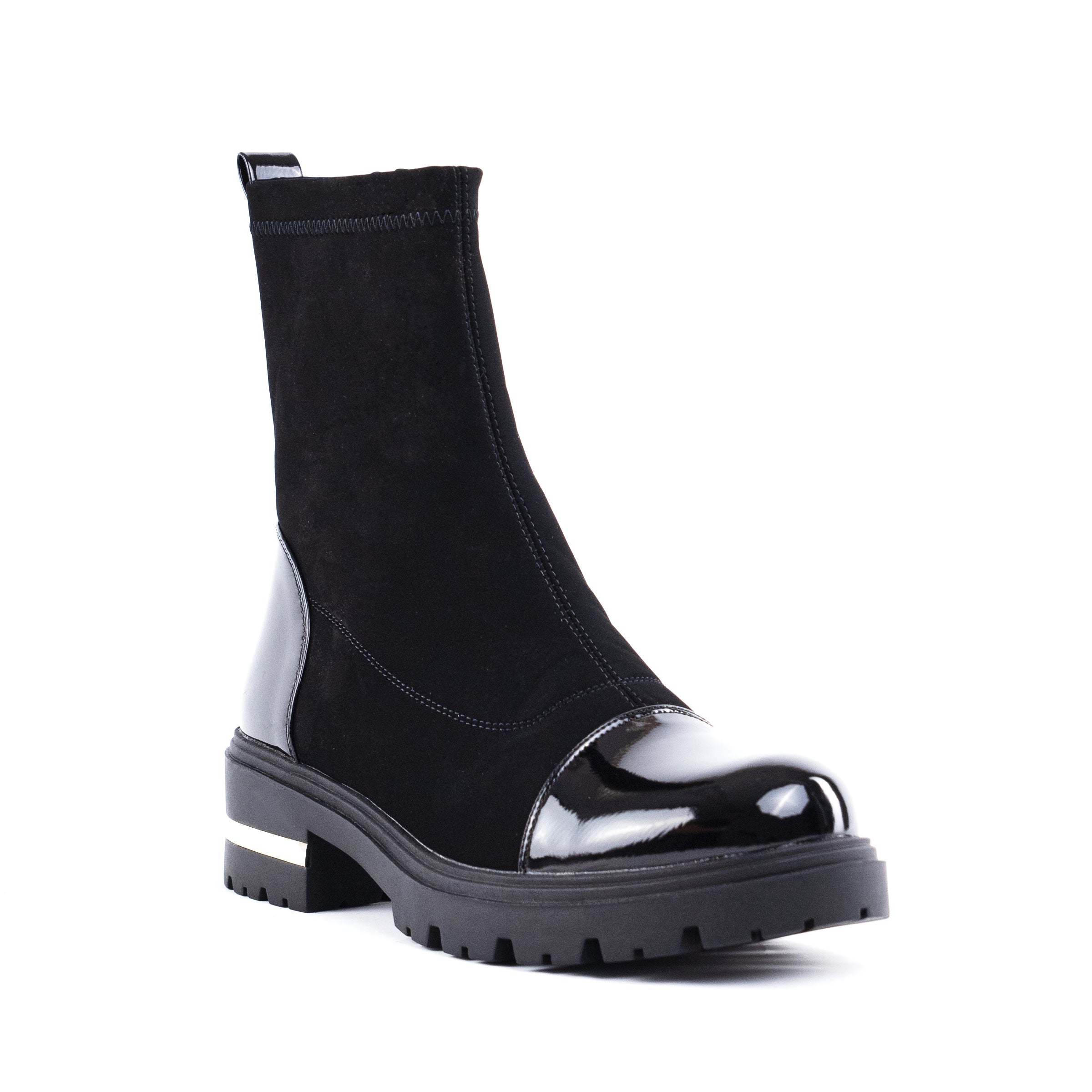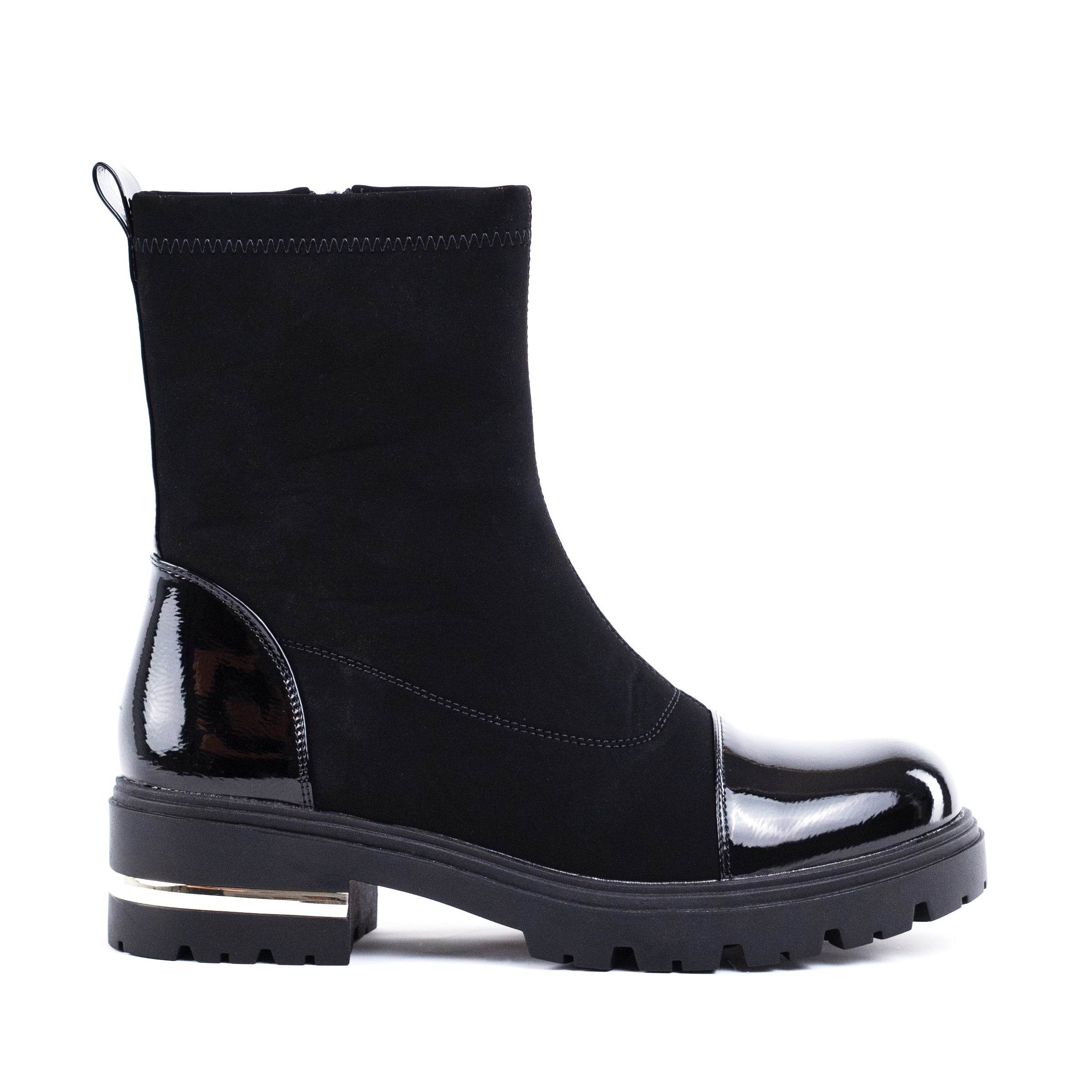 Ghetele damă negre Vanida sunt un model elegant cu accente moderne, ideal pentru femeile care își doresc un look sofisticat, dar confortabil. Combinația dintre pielea ecologică lucioasă și materialul tip catifea oferă un contrast rafinat și un aspect premium, evidențiat subtil de inserția metalică de la nivelul tocului. Talpa de 4,5 cm asigură stabilitate și confort la purtare, fiind potrivită pentru utilizare zilnică, iar închiderea cu fermoar permite o încălțare rapidă și practică. Versatile și ușor de asortat, ghetele Vanida completează armonios atât ținutele casual, cât și pe cele elegante, adăugând un plus de stil oricărei apariții.