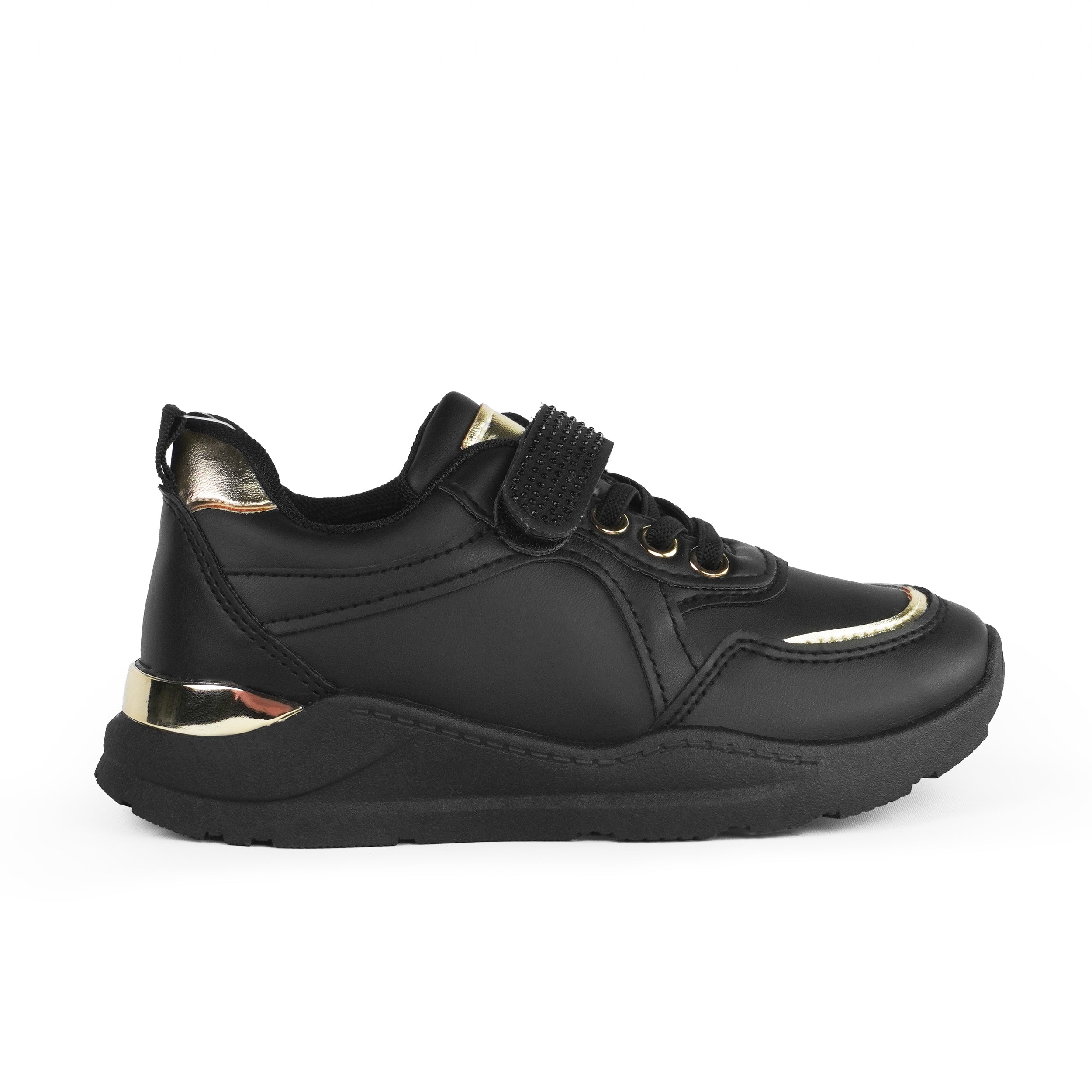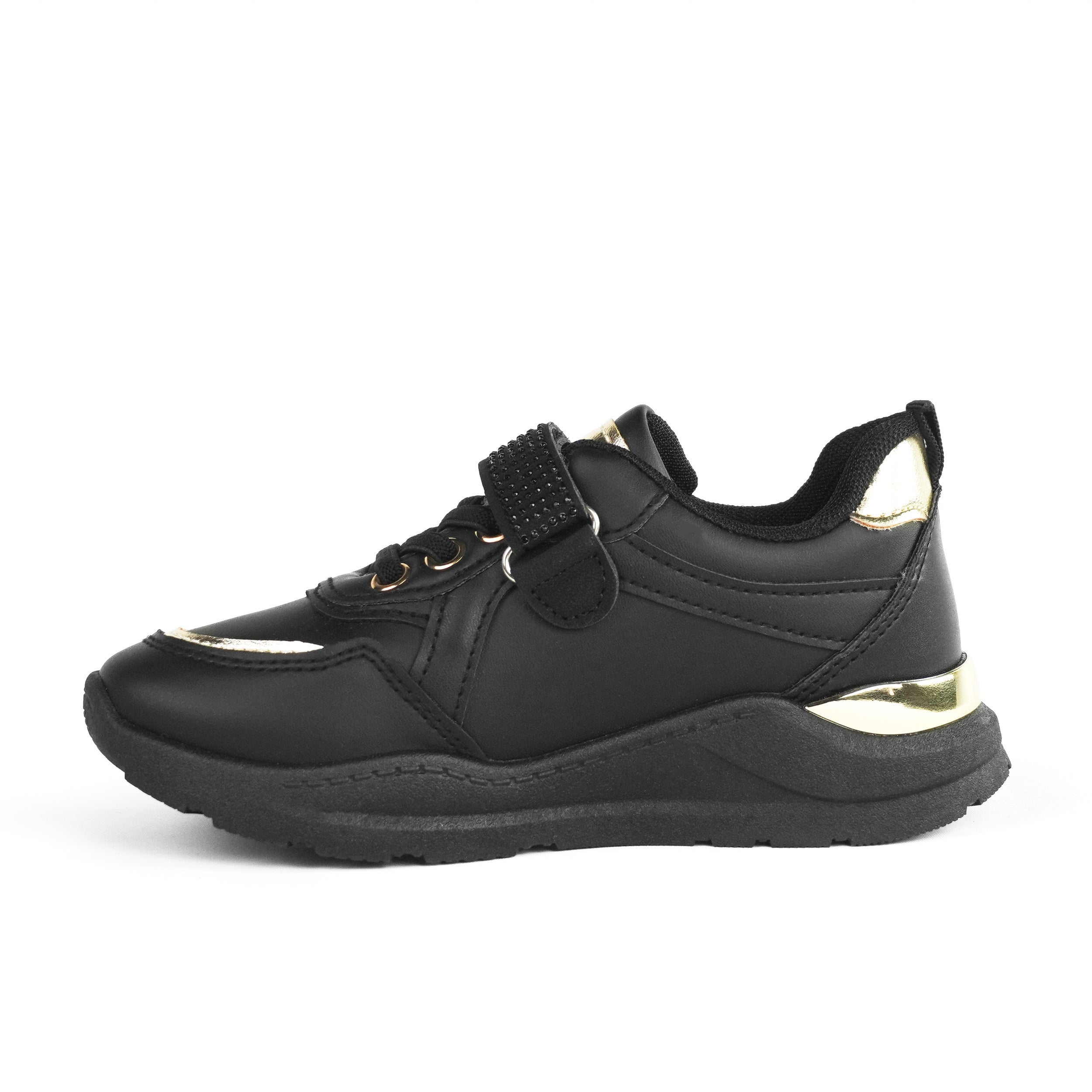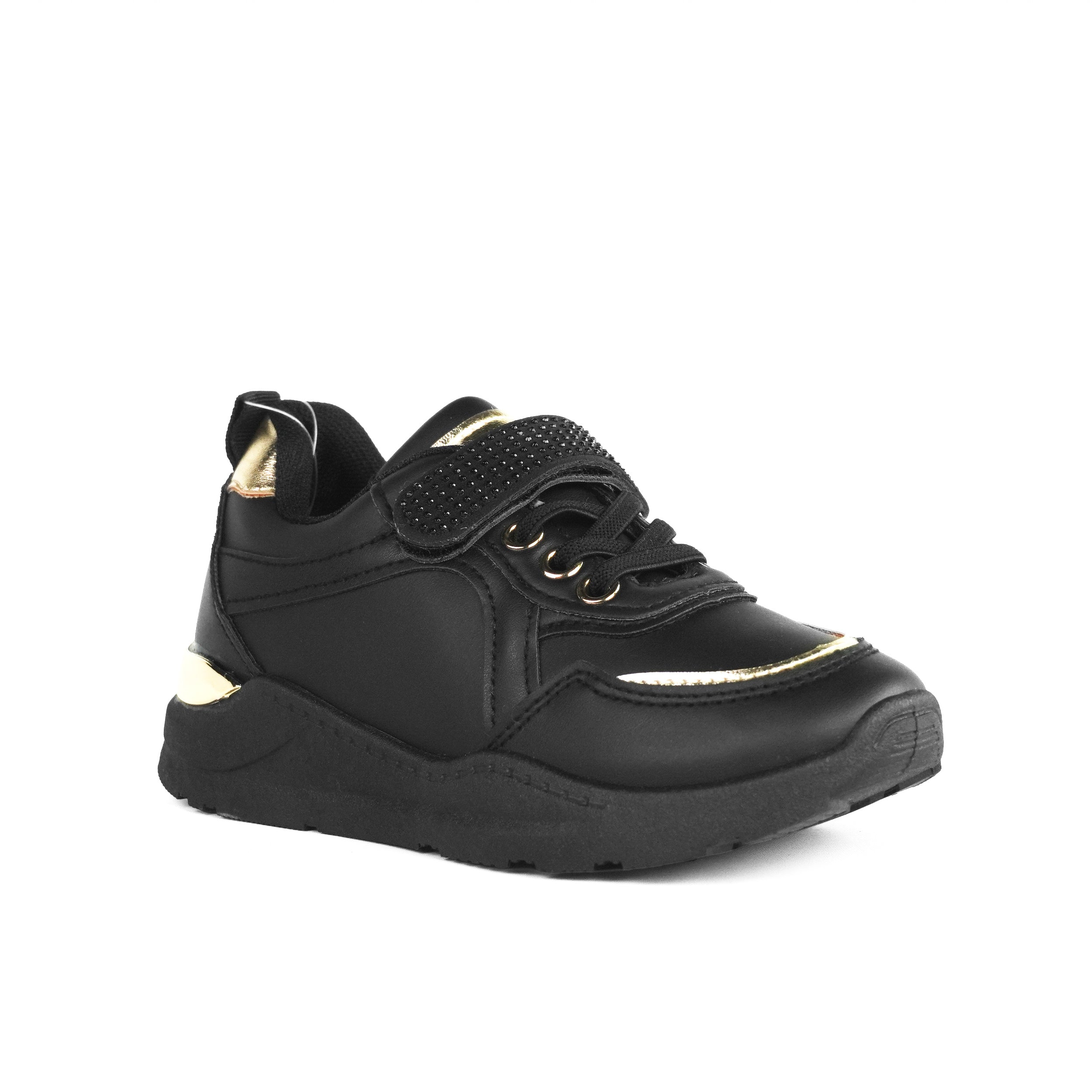 Pantofii sport pentru fete negru Nyra sunt alegerea perfectă pentru un stil modern și confortabil în fiecare zi. Realizați din piele ecologică de calitate, sunt rezistenți și ușor de întreținut, iar talpa flexibilă de 2 cm oferă susținere la mers și stabilitate. Designul negru elegant este completat de detalii aurii metalizate și accesorii discrete cu strasuri pe banda cu scai, adăugând o notă rafinată, potrivită pentru fetițele care adoră să iasă în evidență. Închiderea practică cu șiret și scai permite ajustare perfectă pe picior și încălțare rapidă, fiind ideali pentru școală, activități zilnice sau plimbări. Confortabili, versatili și ușor de asortat, pantofii sport Nyra sunt combinația ideală între util și estetic.