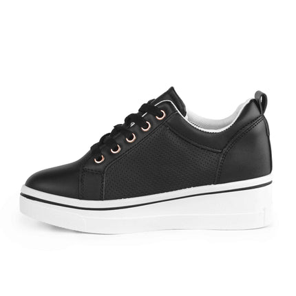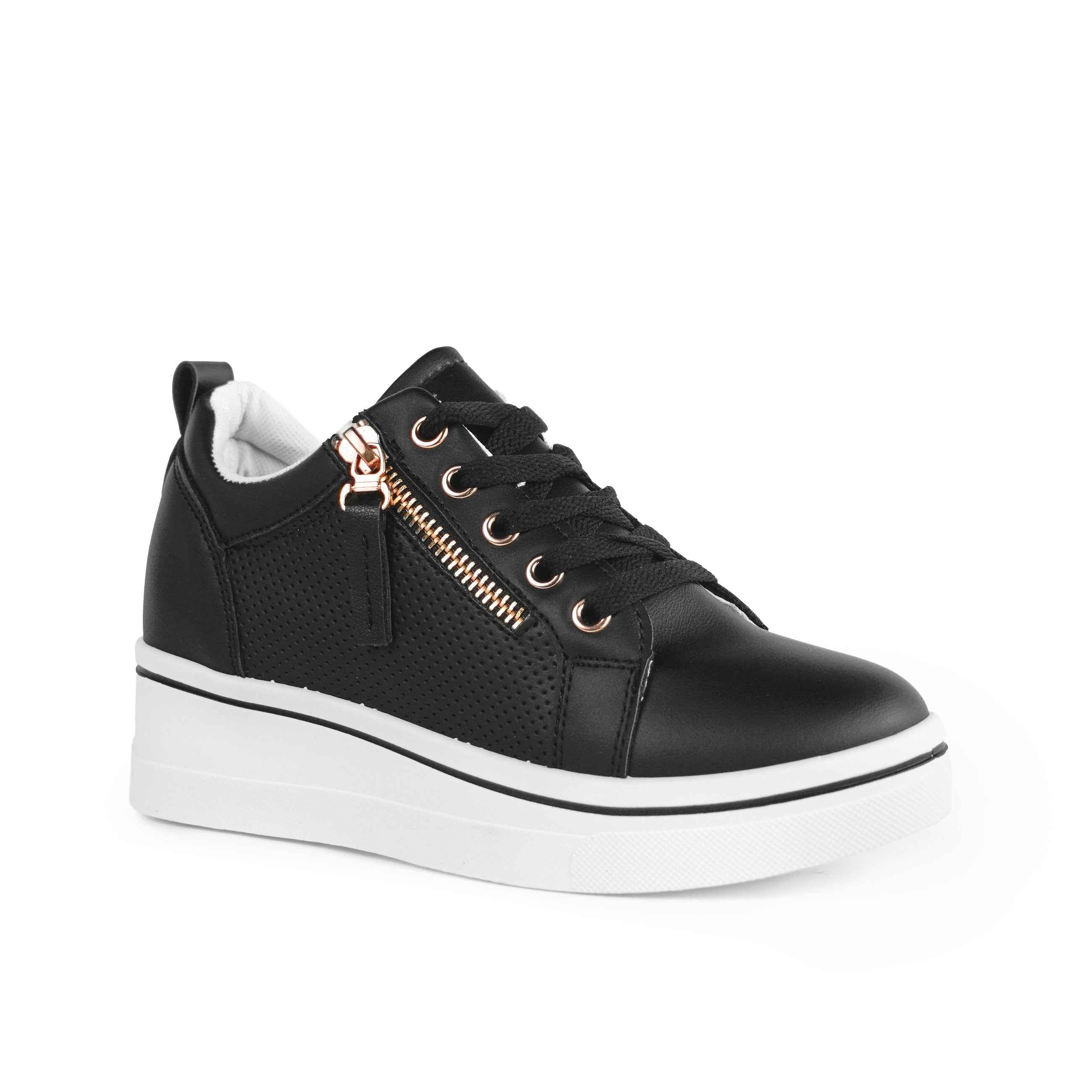 Platformă modernă și detalii elegante – pantofii sport Casey în negru clasic Pantofii sport Casey în varianta neagră sunt perfecți pentru femeile care adoră un stil urban cu accente rafinate. Designul simplu este pus în valoare de fermoarul decorativ auriu rose și perforațiile laterale, în timp ce platforma de 4,5 cm adaugă înălțime și un aer feminin, fără să compromită confortul. Concepuți din material textil și prevăzuți cu închidere cu șiret, acești pantofi îți oferă susținere și libertate de mișcare, indiferent de activitate.