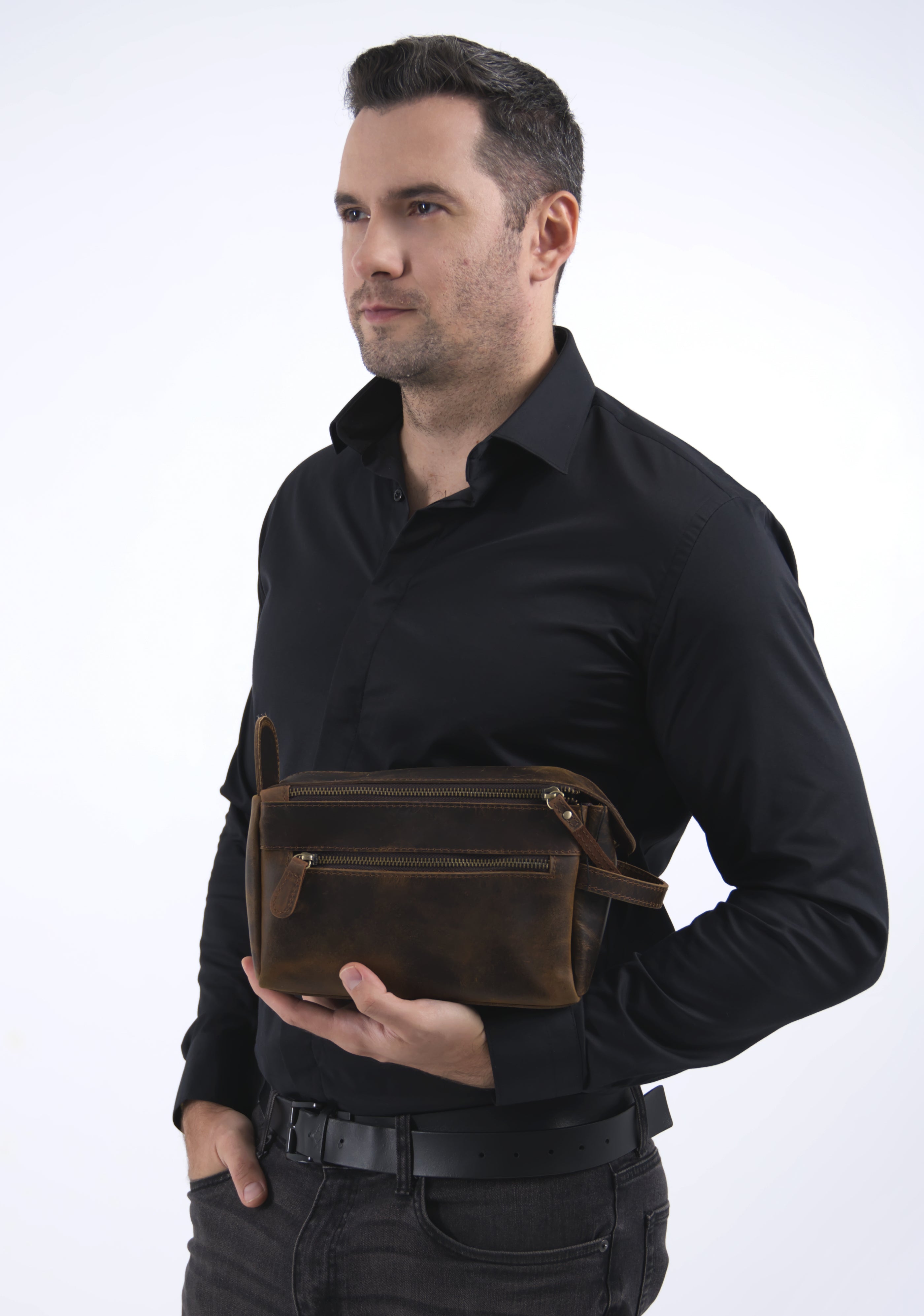 Jean este o geanta pentru barbati, care se poarta in mana. Este din piele naturala in totalitate, cu un aspect diferit. Are un singur compartiment care se deschide cu ajutorul unui fermoar dublu; atat pe o parte, cat si pe cealtalta. Buzunarele sunt in numar de patru, doua fiind interioare iar celelalte doua exterioare. Are o nuanta de cafeniu care scoate foarte bine in evidentea frumusetea pielii. Lateral, are o bretea care te ajuta sa o ti mai bine in mana. Spatiu are, frumusete are. Crezi ca iti este pe plac?