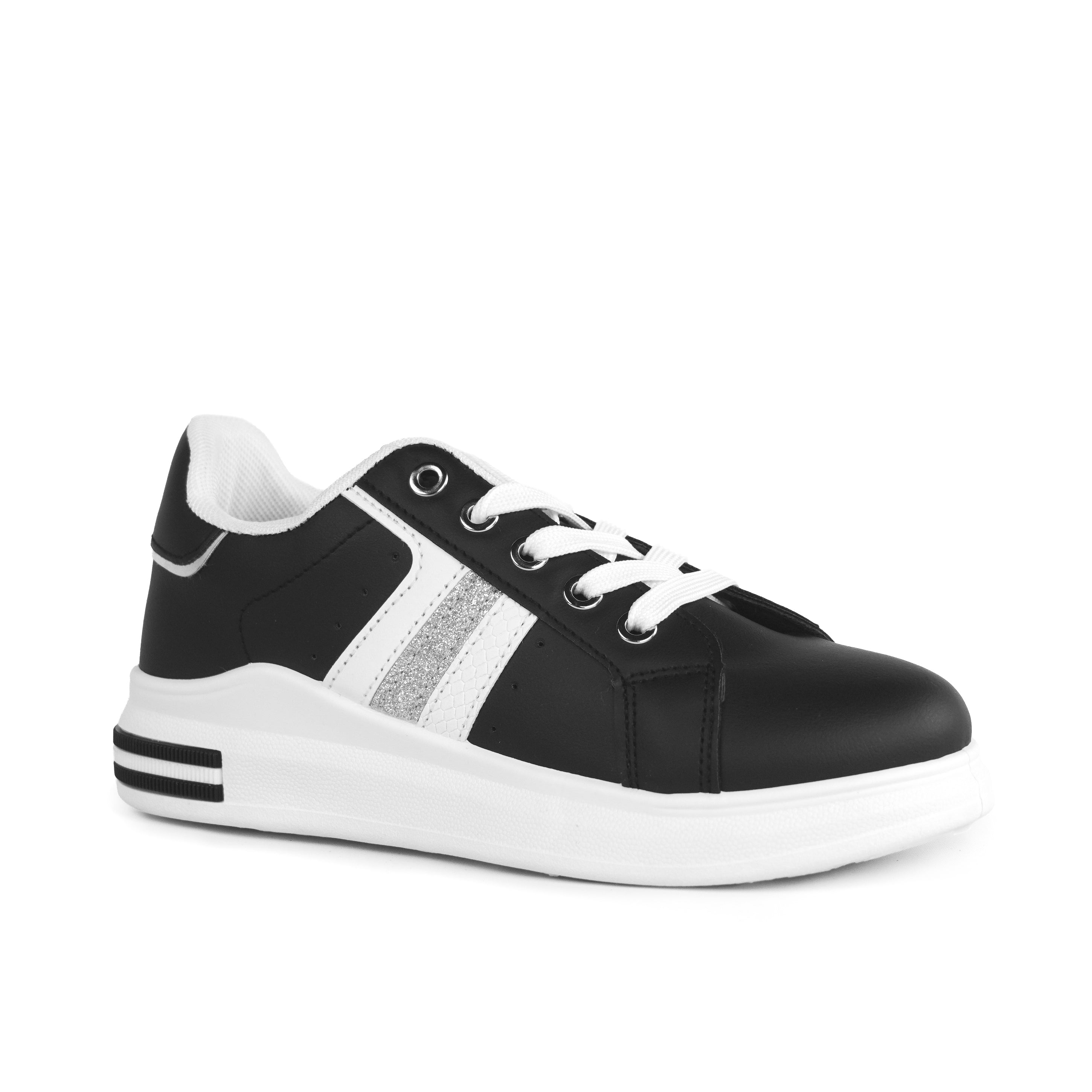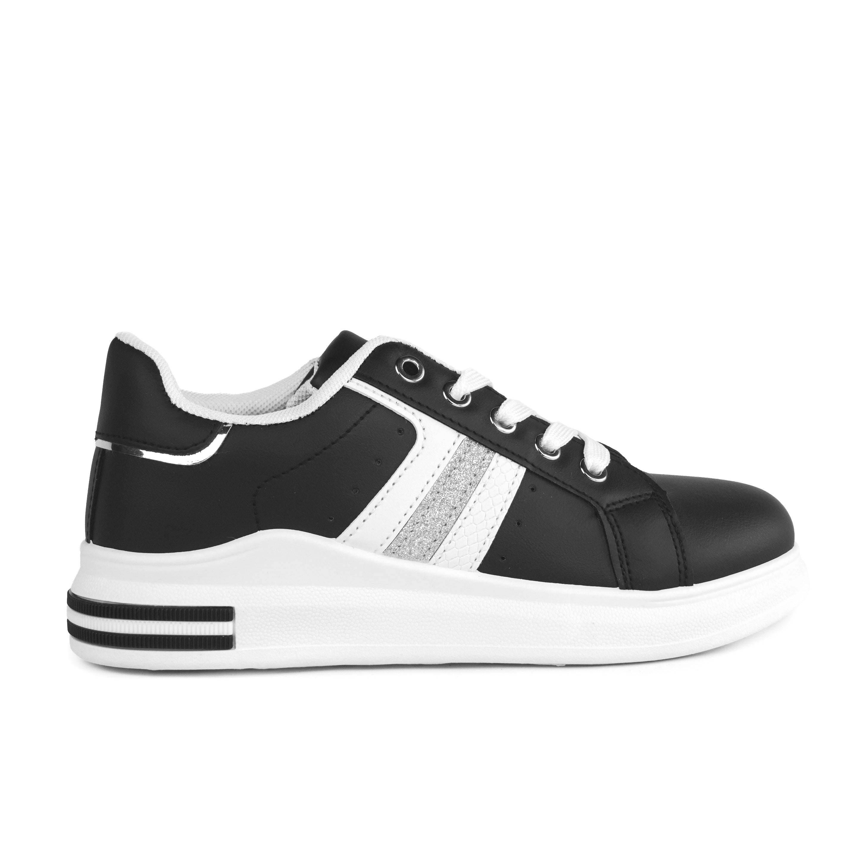Pantofii sport pentru fete negru Mabel îmbină perfect eleganța modernă cu confortul de zi cu zi, fiind ideali pentru școală, plimbări sau ieșiri casual. Realizați din piele ecologică de calitate, aceștia oferă o textură fină și o rezistență îndelungată la purtare. Designul clasic în negru este accentuat de dungi albe și o inserție discretă cu glitter argintiu, care adaugă o notă feminină și rafinată. Talpa groasă de 3,8 cm asigură susținere și confort la fiecare pas, contribuind la o postură corectă și o stabilitate excelentă. Închiderea cu șiret permite ajustarea perfectă pe picior, iar interiorul moale oferă o senzație plăcută pe tot parcursul zilei. Modelul Mabel este versatil și ușor de asortat, potrivindu-se atât cu jeanși, cât și cu rochițe casual. Perfecți pentru micile fashioniste care iubesc detaliile simple, dar elegante, acești pantofi aduc un plus de stil oricărei ținute.
